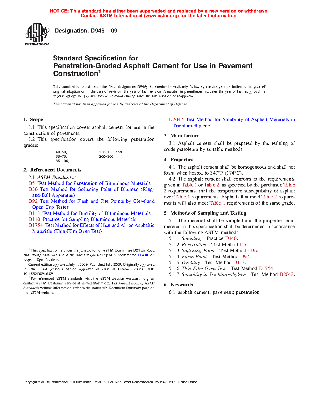 This specification covers the standard for asphalt cement proposed for use in the construction of pavements. This specification shall include the following penetration grades: 40-50, 60-70, 85-100, 120-150, and 200-300. The cements shall be manufactured by refining crude petroleum through suitable methods. The asphalt cement shall be homogeneous and shall not foam when heated to application temperature. Requirements such as ductility, flash point, solubility in trichloroethylene, and penetration shall be determined in accordance with ASTM test methods.