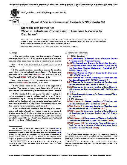 1.1 This test method covers the determination of water in the range from 0 % to 25 % by volume in petroleum products, tars, and other bituminous materials by the distillation method.