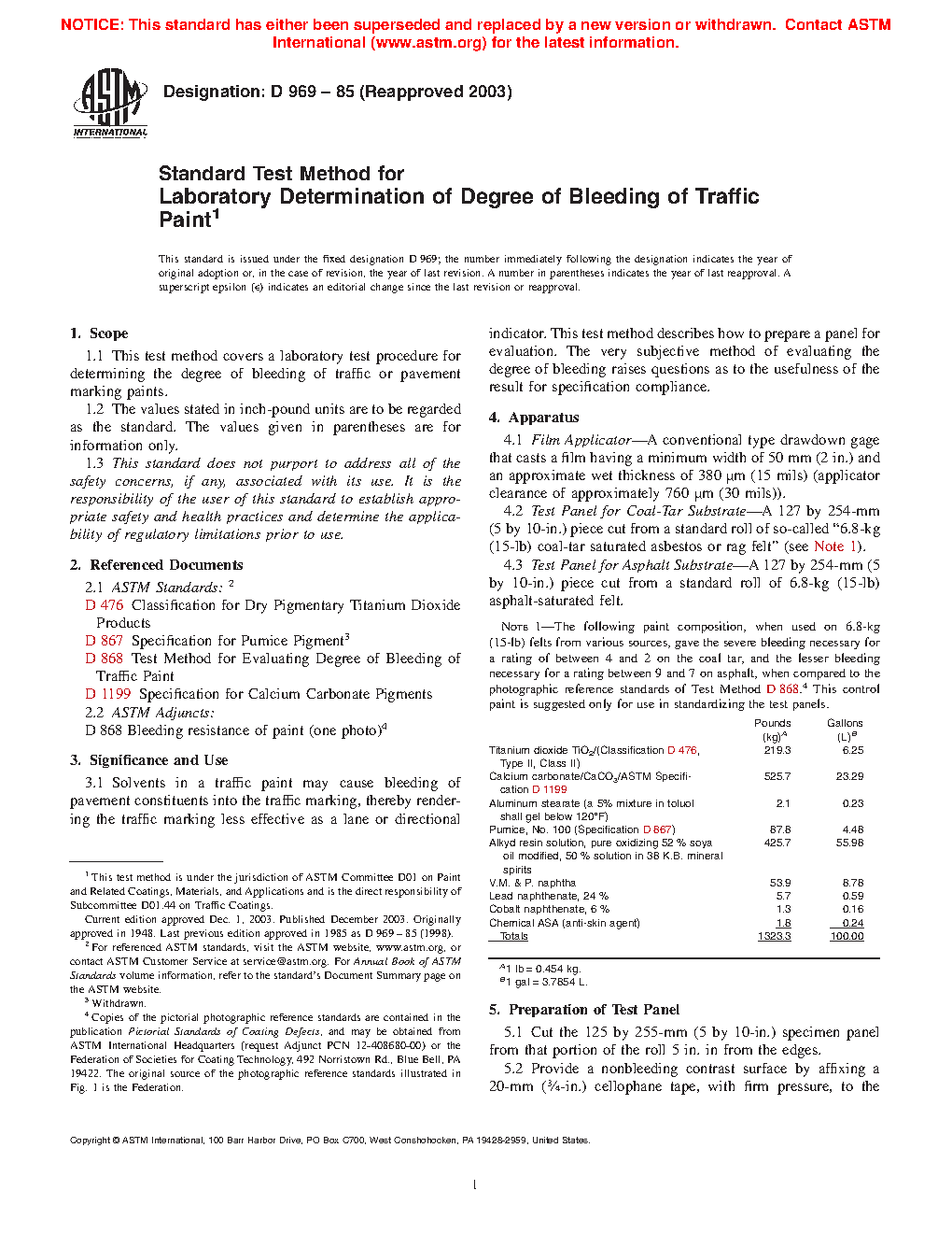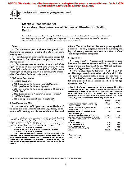 1.1 This test method covers a laboratory test procedure for determining the degree of bleeding of traffic or pavement marking paints.