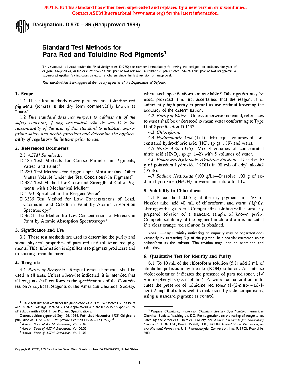Standard Test Methods for Para Red and Toluidine Red Pigments (Withdrawn 2003)