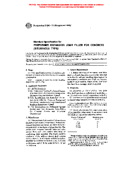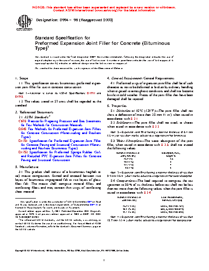 1.1 This specification covers bituminous preformed expansion joint filler for use in concrete construction.