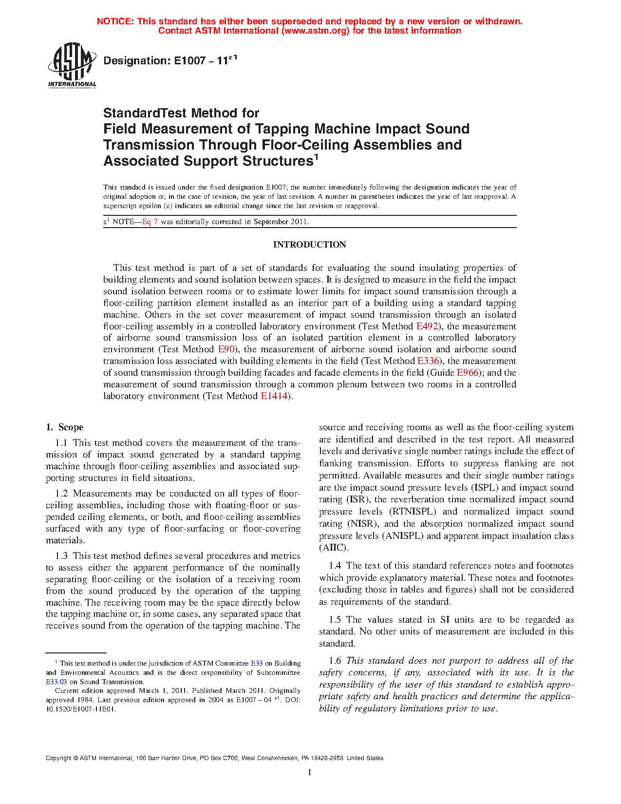 1.4 The ISPL and ISR are measurable and reportable between any two specific rooms or usage areas where the source room area is large enough to accommodate the tapping machine positions and the receiving room volume is sufficiently large to accommodate the microphone positions. For all other measures and ratings in this standard, restrictions such as minimum room volume or dimensions or maximum room absorption are imposed. Thus, conditions exist that will not allow RTNISPL (NISR) or ANISPL (AIIC) to be determined.
