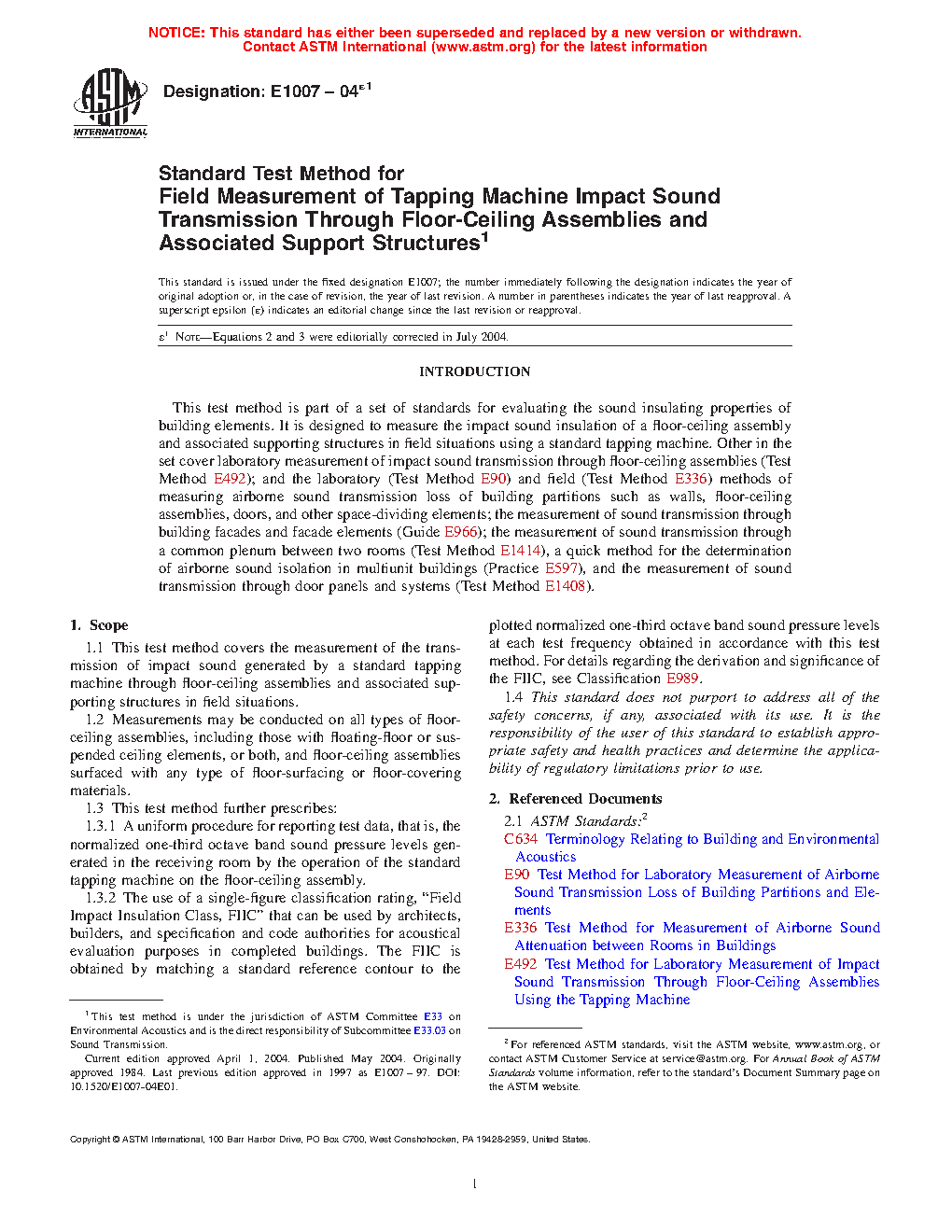 1.1 This test method covers the measurement of the transmission of impact sound generated by a standard tapping machine through floor-ceiling assemblies and associated supporting structures in field situations.