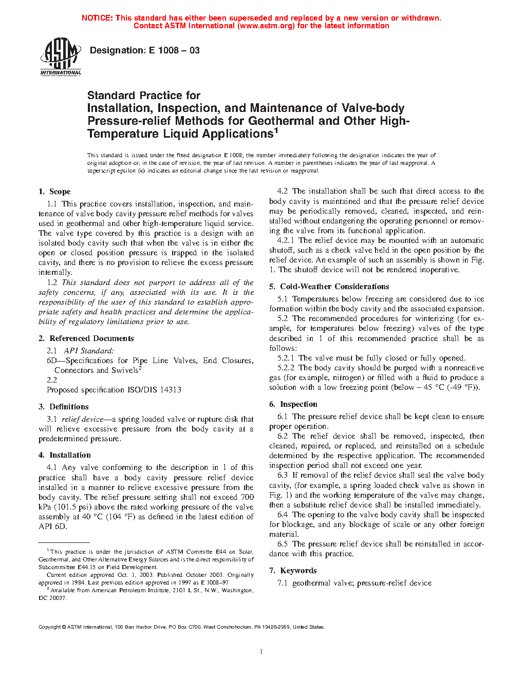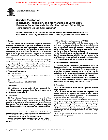 1.1 This practice covers installation, inspection, and maintenance of valve body cavity pressure relief methods for valves used in geothermal and other high-temperature liquid service. The valve type covered by this practice is a design with an isolated body cavity such that when the valve is in either the open or closed position pressure is trapped in the isolated cavity, and there is no provision to relieve the excess pressure internally.