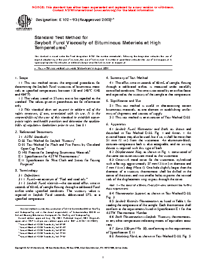 1.1 This test method covers the empirical procedures for determining the Saybolt Furol viscosities of bituminous materials at specified temperatures between 120 and 240°C (248 and 464°F).