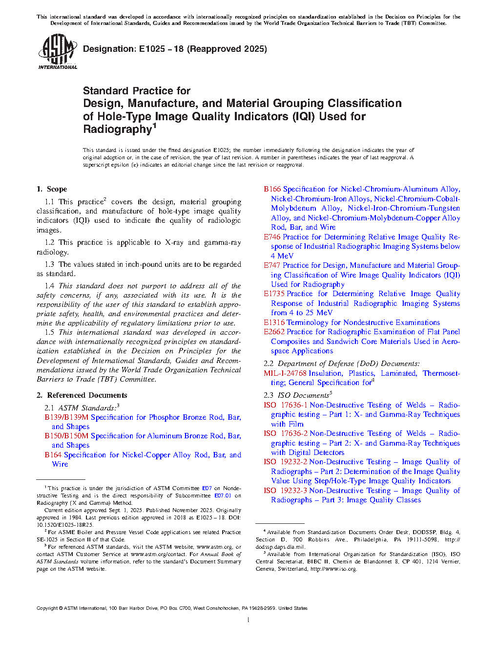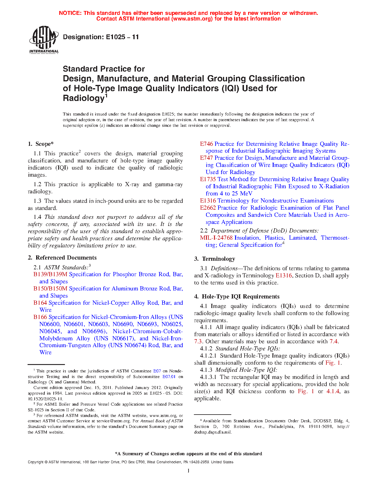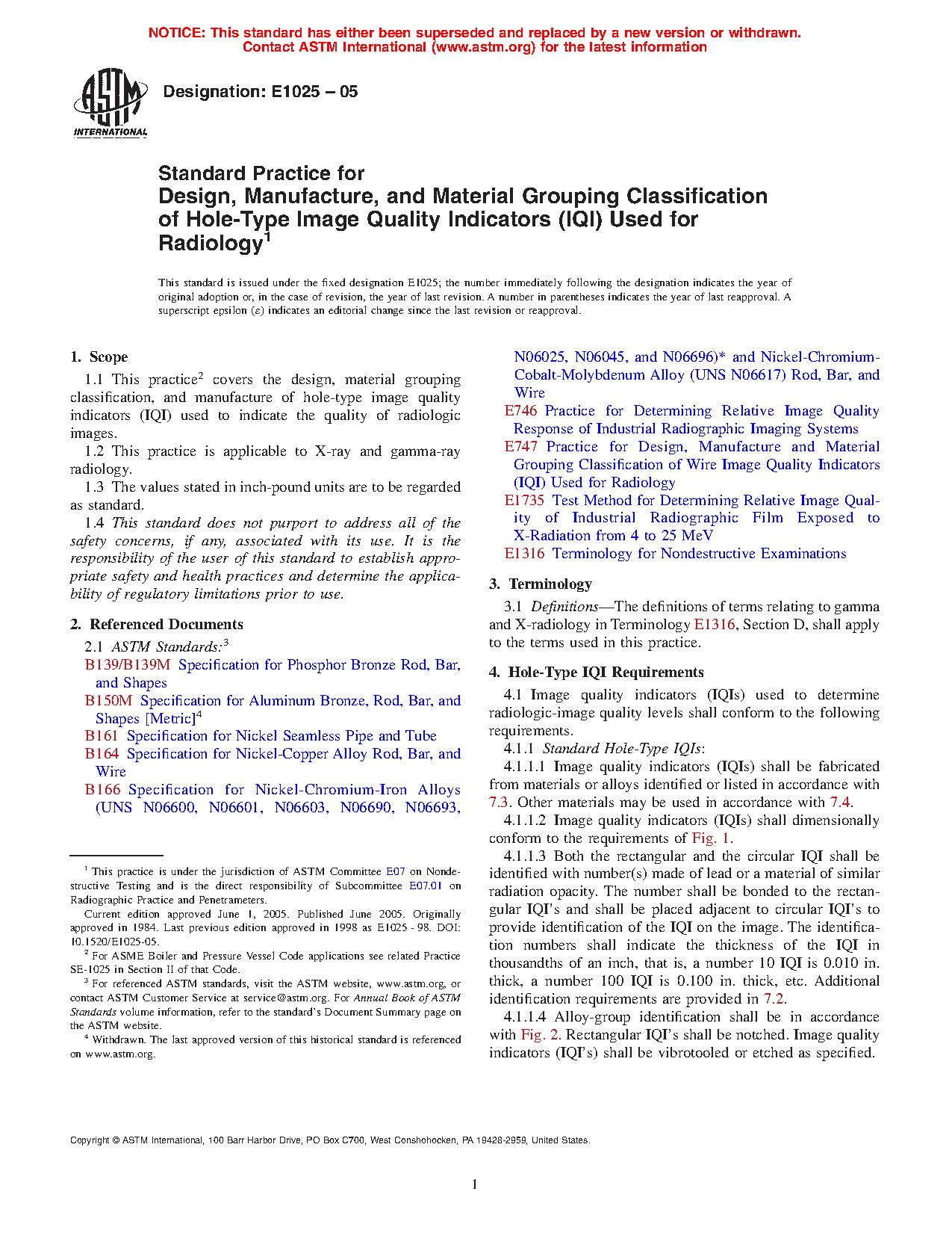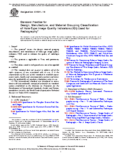 1.1 This practice covers the design, material grouping classification, and manufacture of hole-type image quality indicators (IQI) used to indicate the quality of radiologic images.