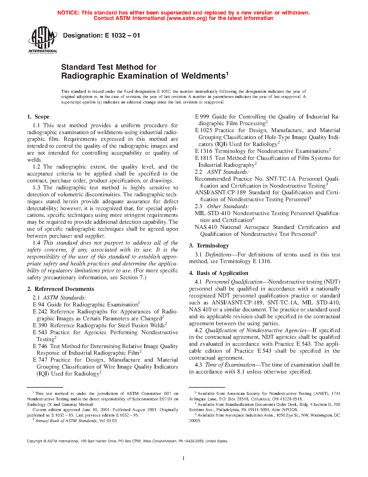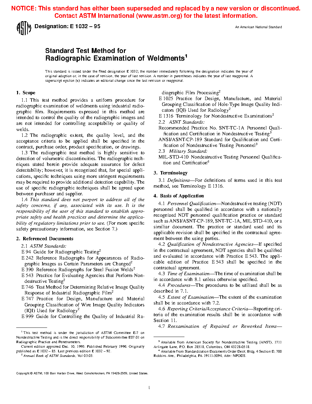 1.3 The radiographic techniques stated herein provide adequate assurance for defect detectability; however, it is recognized that, for special applications, specific techniques using more or less stringent requirements may be required than those specified. In these cases, the use of alternative radiographic techniques shall be as agreed upon between purchaser and supplier (also see Section 4).