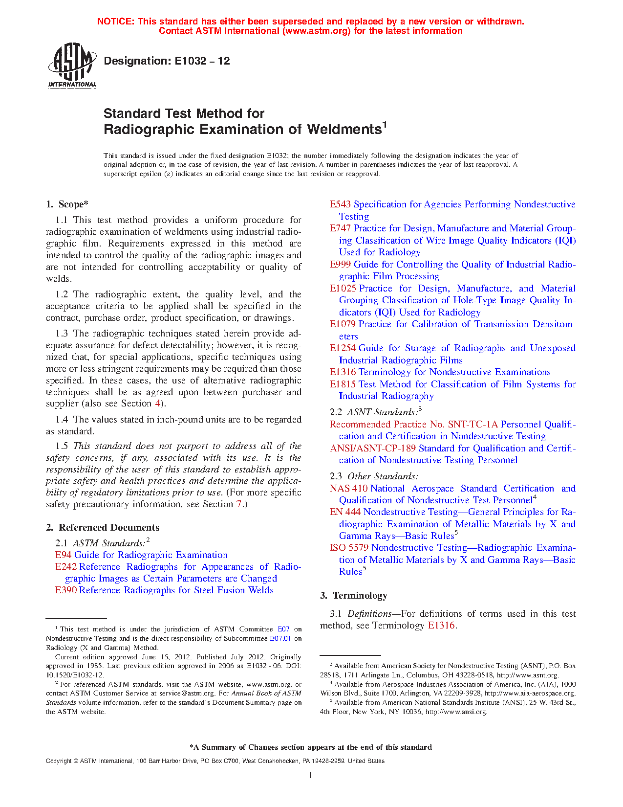 1.1 This practice provides a uniform procedure for radiographic examination of weldments using industrial radiographic film. Requirements expressed in this practice are intended to control the quality of the radiographic images and are not intended for controlling acceptability or quality of welds.