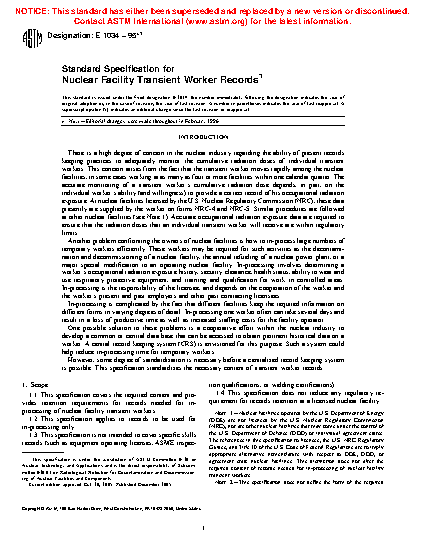 Note 1—Nuclear facilities operated by the U.S. Department of Energy (DOE) are not licensed by the U.S. Nuclear Regulatory Commission (NRC), nor are other nuclear facilities that may come under the control of the U.S. Department of Defense (DOD) or individual agreement states. The references in this specification to licensee, the U.S. NRC Regulatory Guides, and Title 10 of the U.S. Code of Federal Regulations are to imply appropriate alternative nomenclature with respect to DOE, DOD, or agreement state nuclear facilities. This distinction does not alter the required content of records needed for in-processing of nuclear facility transient workers. Note 2—This specification does not define the form of the required worker records (such as a passport or central computerized record keeping system).Technical characteristics