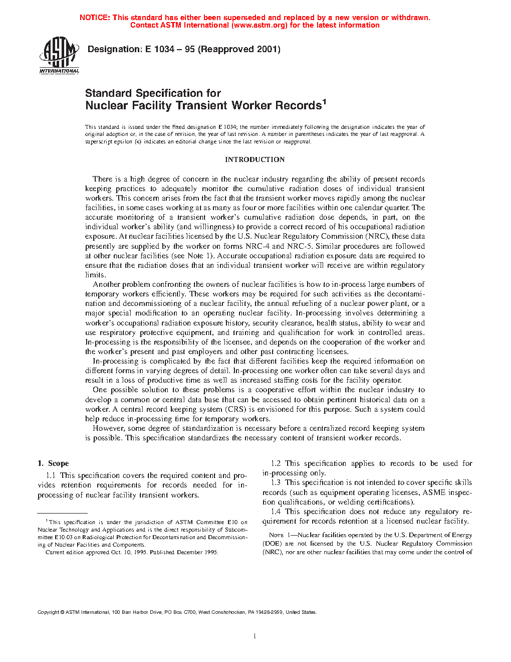1.1 This specification covers the required content and provides retention requirements for records needed for in-processing of nuclear facility transient workers.