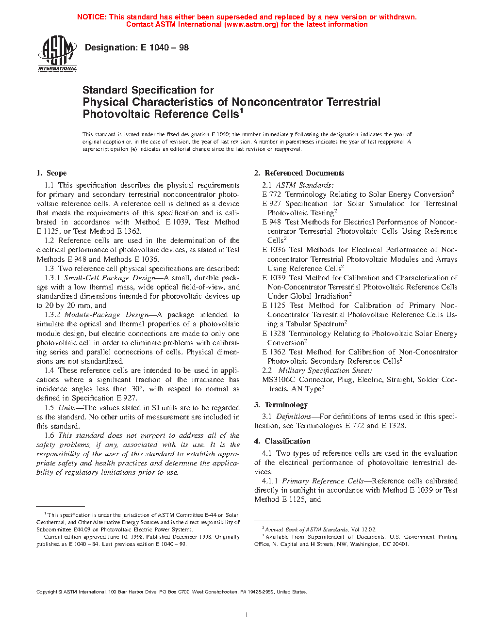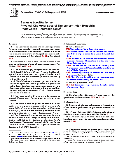 1.1 This specification describes the physical requirements for primary and secondary terrestrial nonconcentrator photovoltaic reference cells. A reference cell is defined as a device that meets the requirements of this specification and is calibrated in accordance with Test Method E 1125 or Test Method E 1362.