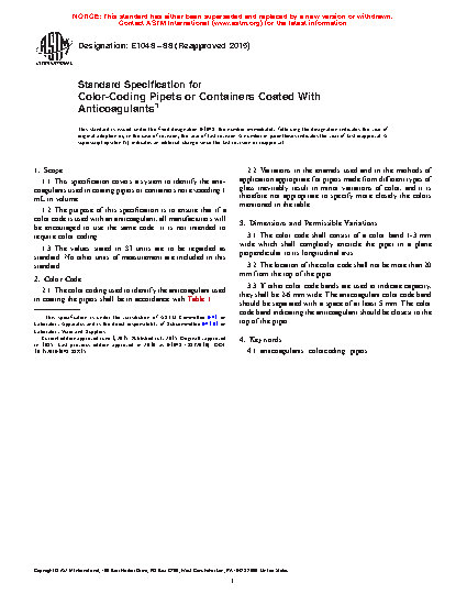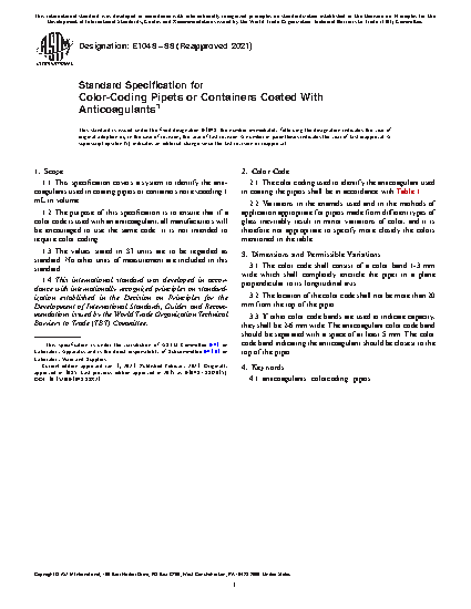 This specification establishes a color-coding system to identify the anticoagulants used in coating pipets or containers not exceeding 1 mL in volume. Its purpose is to ensure that if a color code is used with an anticoagulant, all manufacturers will be encouraged, though not required, to use the same code.