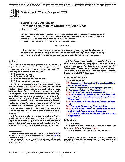 1.1 These test methods cover procedures for estimating the depth of decarburization of steels irrespective of the composition, matrix microstructure, or section shape. The following basic procedures may be used: