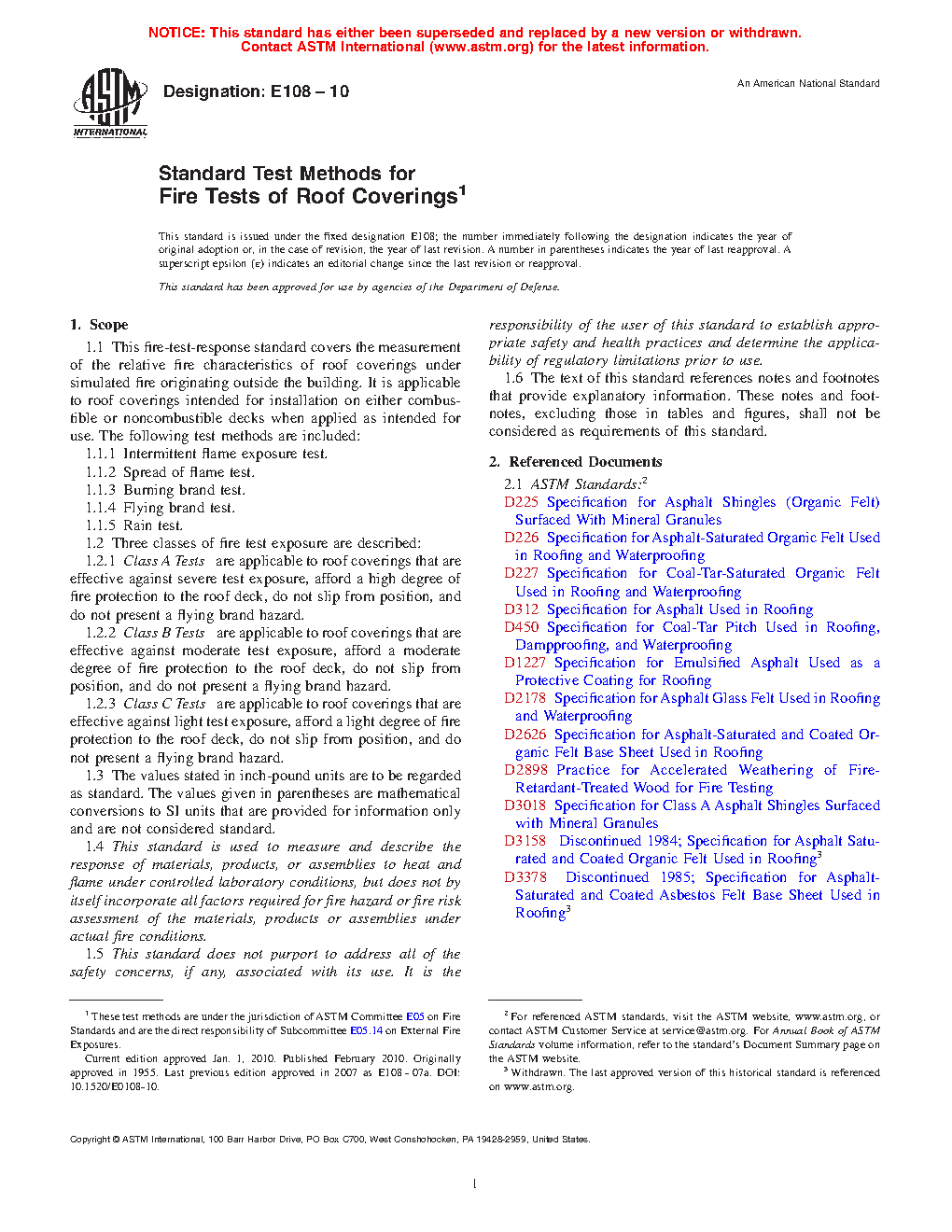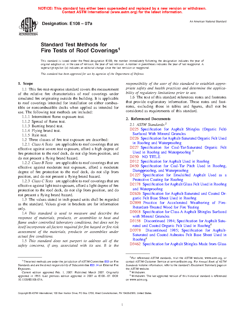1.1 This fire-test-response standard covers the measurement of the relative fire characteristics of roof coverings exposed to simulated fire sources originating outside the building. It is applicable to roof coverings intended for installation on either combustible or noncombustible roof decks when applied as intended for use. The following test methods are included: