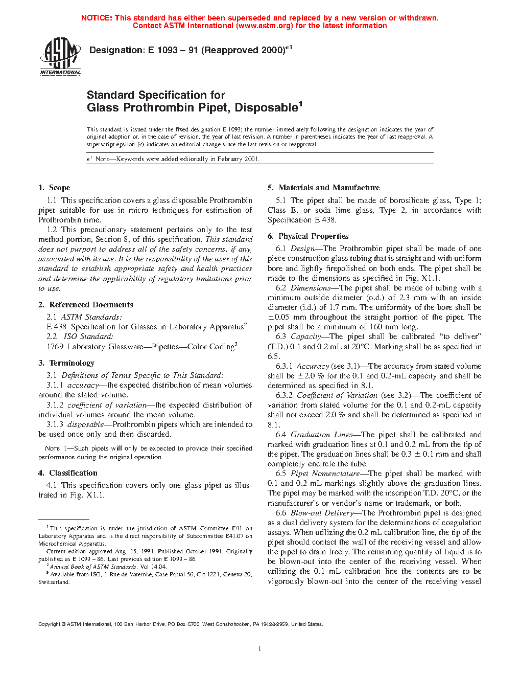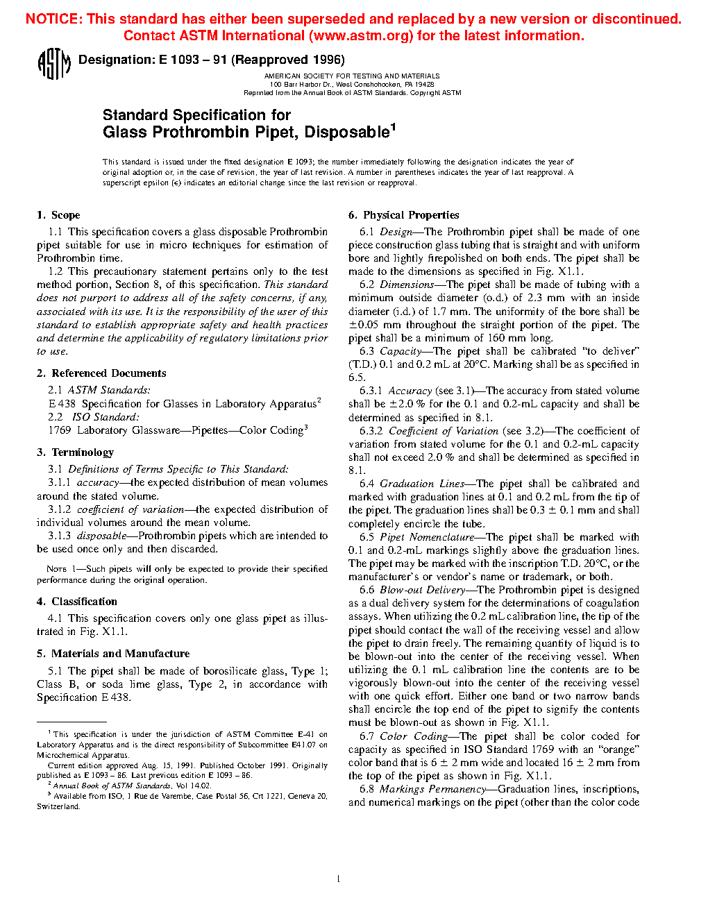 This specification covers the physical requirements and corresponding test methods for disposable glass Prothrombin pipets suitable for use in micro techniques for estimating Prothrombin time. The pipet shall be made of Type 1, Class B borosilicate glass, or Type 2 soda lime glass. The physical properties to which the pipets should adhere to are those for design, dimensions, capacity (accuracy and coefficient of variation), graduation lines, pipet nomenclature, blow-out delivery, color coding, marking permanency, and lot control.