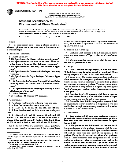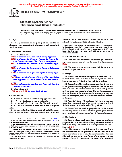 1.1 This specification covers glass graduates suitable for laboratory, pharmaceutical, and other uses, in both conical and cylindrical shapes.