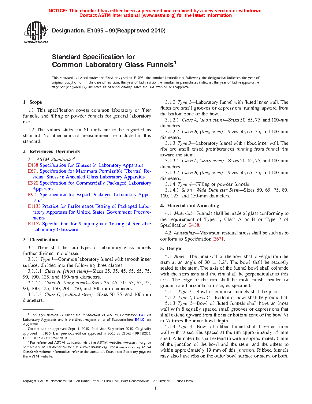 This specification covers common laboratory or filter funnels, and filling or powder funnels for general laboratory use. The laboratory glass funnels shall be classified into four types which are divided into classes. Type 1 is common laboratory funnel with smooth inner surface which is divided into three classes: Class A with short stem, Class B with long stem, and Class C without stem. Type 2 is laboratory funnel with fluted inner wall. The flutes are small grooves or depressions running upward from the bottom zone of the bowl. This type is divided into Class A and Class B. Type 3 is laboratory funnel with ribbed inner wall. The ribs are small raised protuberances from funnel rim toward the stem. Class A and Class B funnels belong to this type. Type 4 is the last type which is filling or powder funnels. This type has short, wide diameter stem.