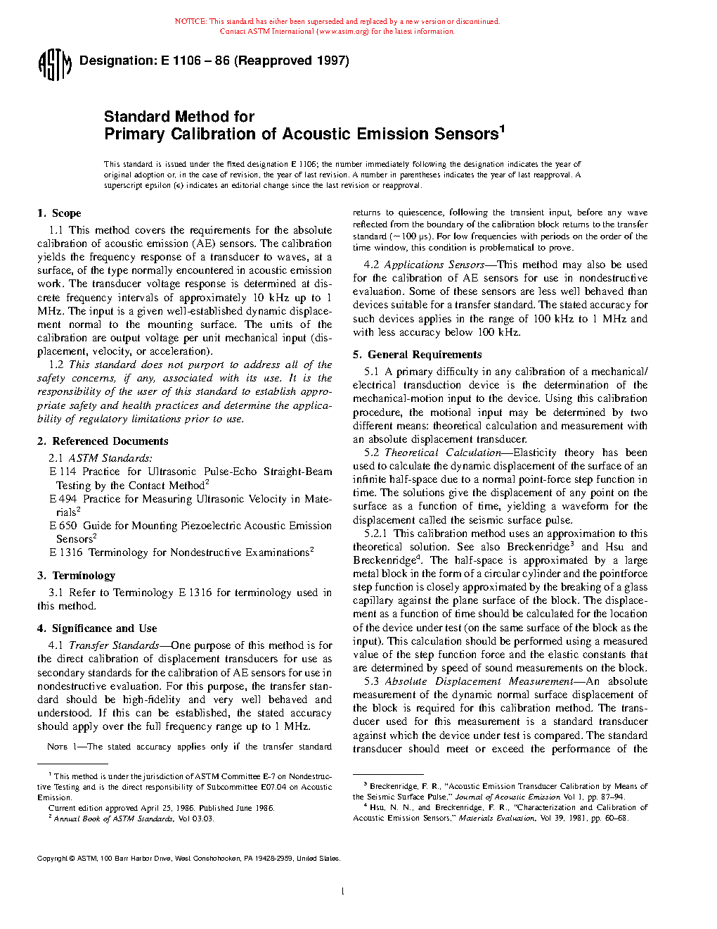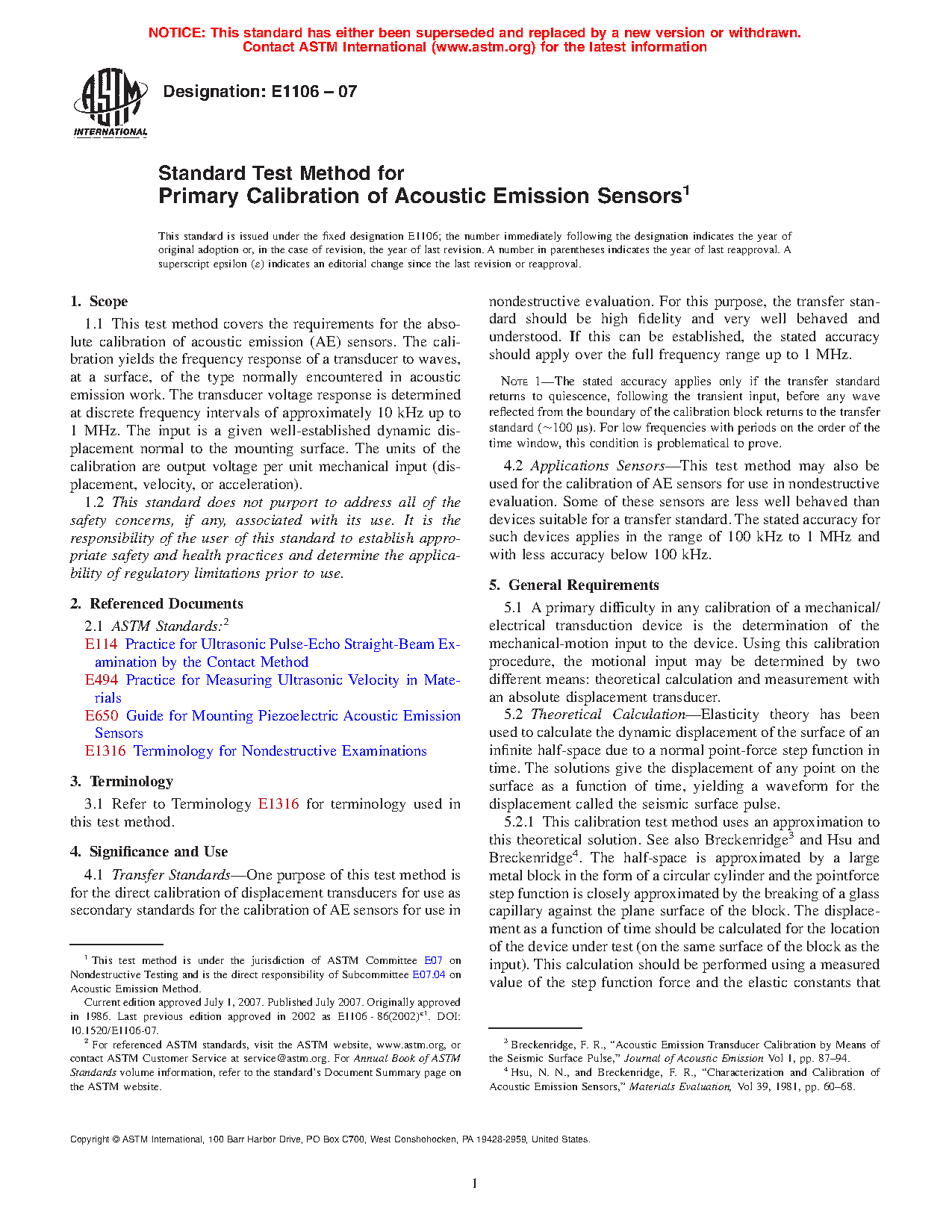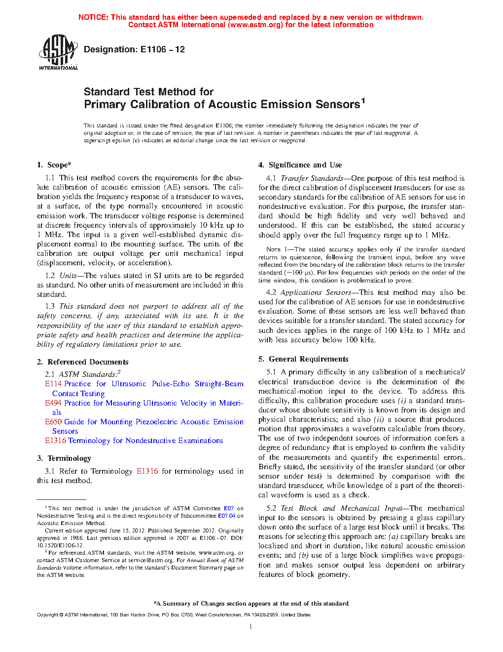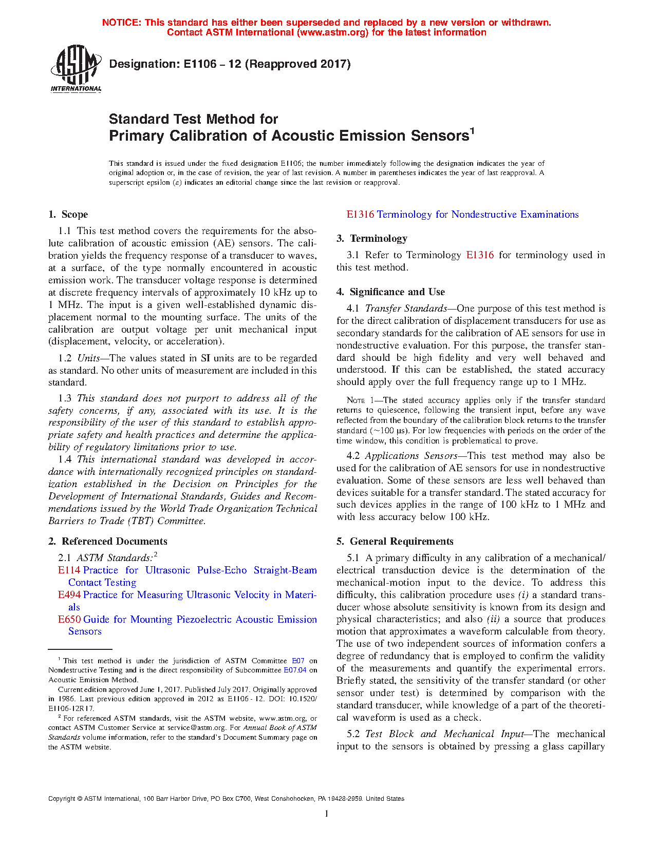 Applications Sensors—This test method may also be used for the calibration of AE sensors for use in nondestructive evaluation. Some of these sensors are less well behaved than devices suitable for a transfer standard. The stated accuracy for such devices applies in the range of 100 kHz to 1 MHz and with less accuracy below 100 kHz.