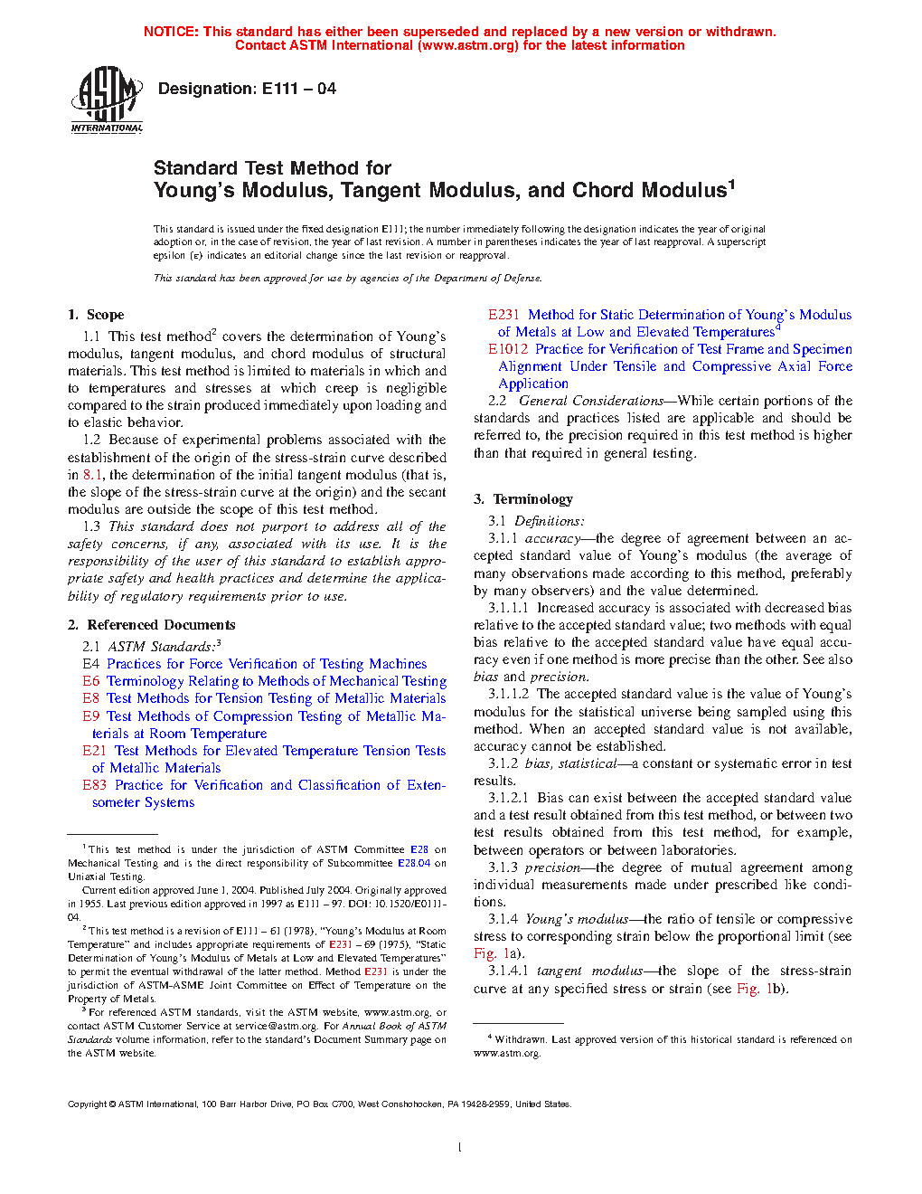 1.1 This test method covers the determination of Young's modulus, tangent modulus, and chord modulus of structural materials, see Fig. 1. This test method is limited to materials in which and to temperatures and stresses at which creep is negligible compared to the strain produced immediately upon loading and to elastic behavior.
