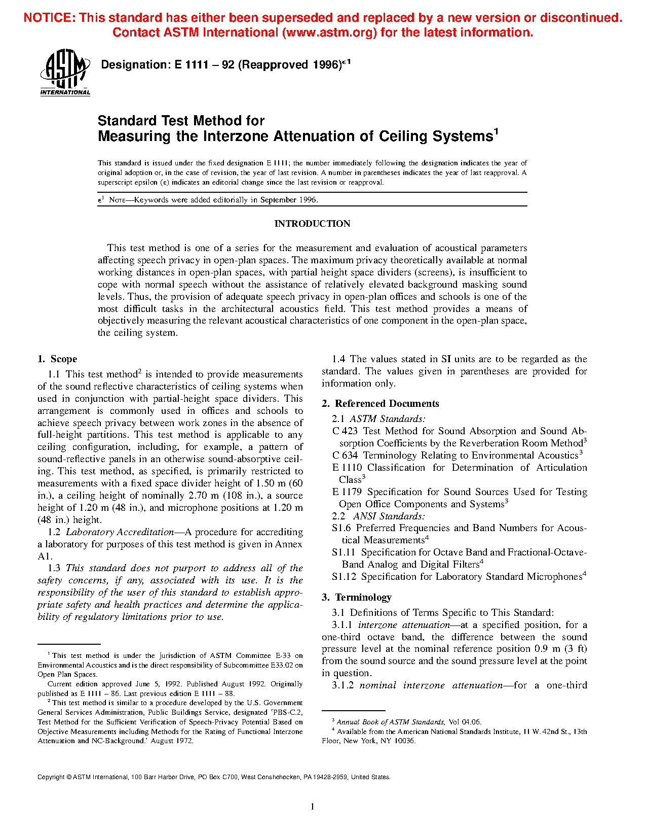 1.1 This test method covers the measurement of the interzone attenuation for three components of open-plan spaces: