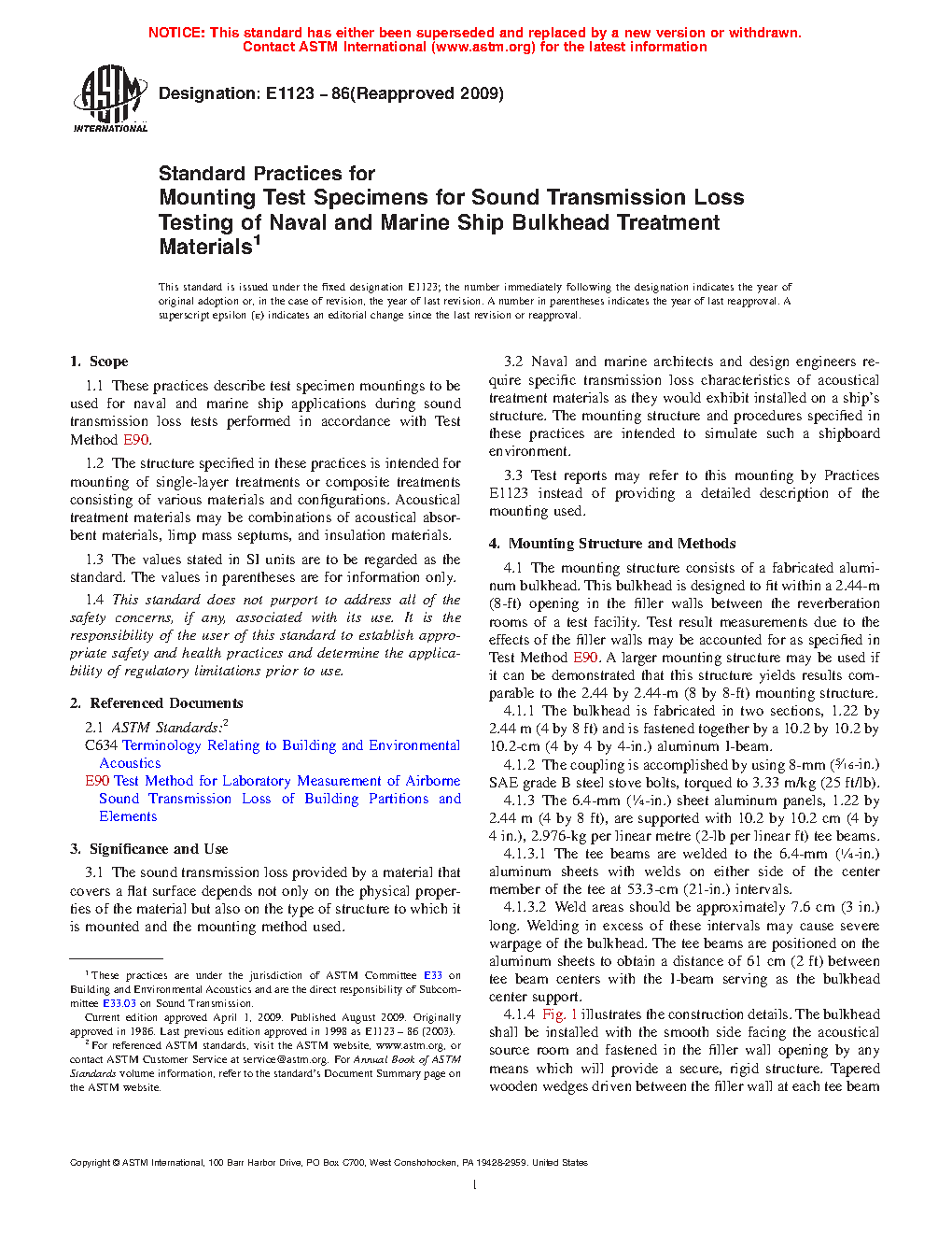 1.1 These practices describe test specimen mountings to be used for naval and marine ship applications during sound transmission loss tests performed in accordance with Test Method E90.