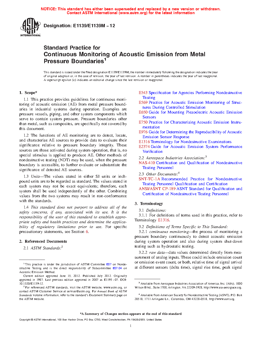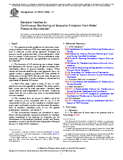 1.1 This practice provides guidelines for continuous monitoring of acoustic emission (AE) from metal pressure boundaries in industrial systems during operation. Examples are pressure vessels, piping, and other system components which serve to contain system pressure. Pressure boundaries other than metal, such as composites, are specifically not covered by this document.