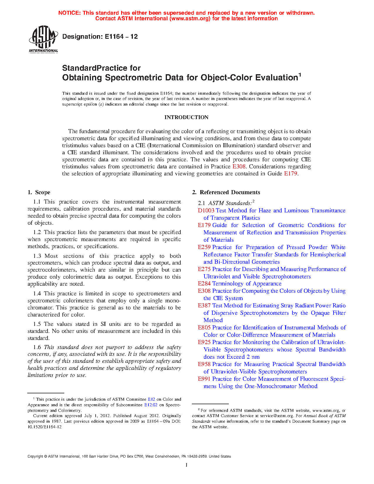 5.1 The most general and reliable methods for obtaining CIE tristimulus values or, through transformation of them, other coordinates for describing the colors of objects are by the use of spectrometric data. Colorimetric data are obtained by combining object spectral data with data representing a CIE standard observer and a CIE standard illuminant, as described in Practice E308.