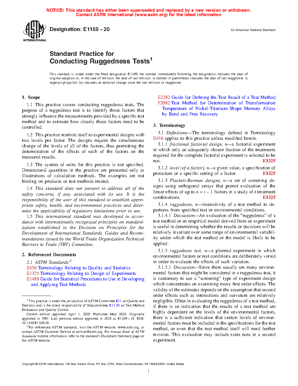 Section Scope 1 Summary of Guide 2 Significance and Use 3 Plackett-Burman Designs Applied to Ruggedness Tests 4 Plackett-Burman Design Calculations 5 Plackett-Burman Design Considerations 6 Interpretation of Results 7 Example 8 Testing Effects from Repeated (pH) Experiments 9 Controllable versus Uncontrollable Factors 10 Additional Information 11 Tables Figures Appendixes Additional Plackett-Burman Designs X1. Short-Cut Calculations X2. References1.4 This standard may involve hazardous materials, operations, and equipment. This standard does not purport to address all of the safety problems associated with its use. It is the responsibility of the user of this standard to establish appropriate safety and health practices and determine the applicability of regulatory limitations prior to use.