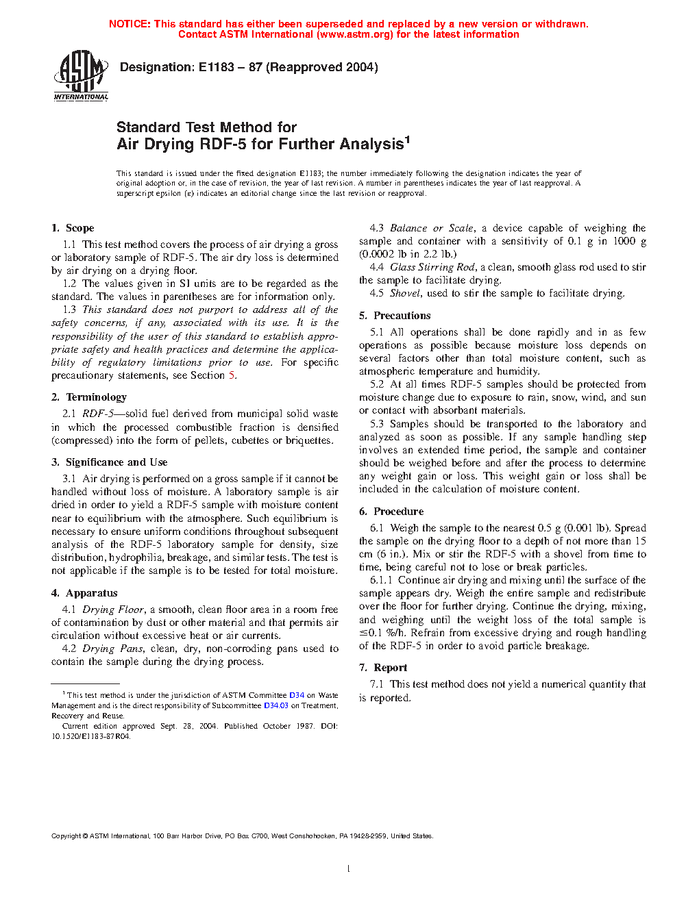 Standard Test Method for Air Drying RDF-5 for Further Analysis