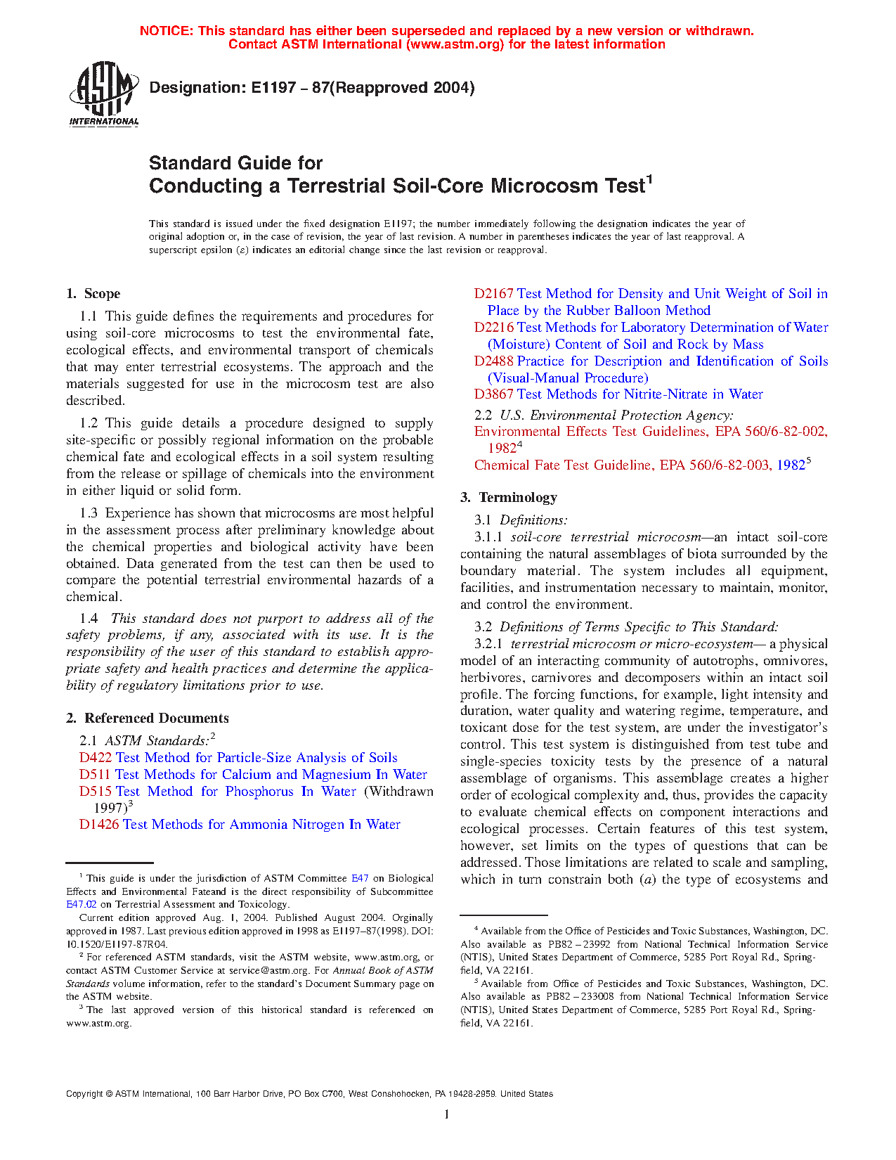4.3 Specifically, this guide is used to determine the effect of a chemical on (1) growth and reproduction of either natural grassland vegetation or crops, and (2) nutrient uptake and cycling within the soil/plant system. Additionally, the soil-core microcosm will provide information on (1) potential for bioaccumulation (enrichment) of the chemical into plant tissues, and (2) the potential for and rate of transport of the chemical through soil to groundwater.