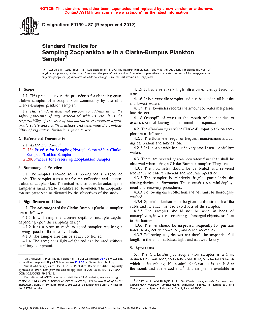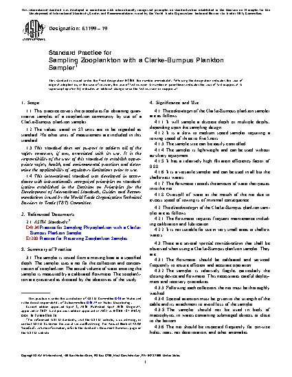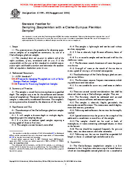 1.1 This practice covers the procedures for obtaining quantitative samples of a zooplankton community by use of a Clarke-Bumpus plankton sampler.