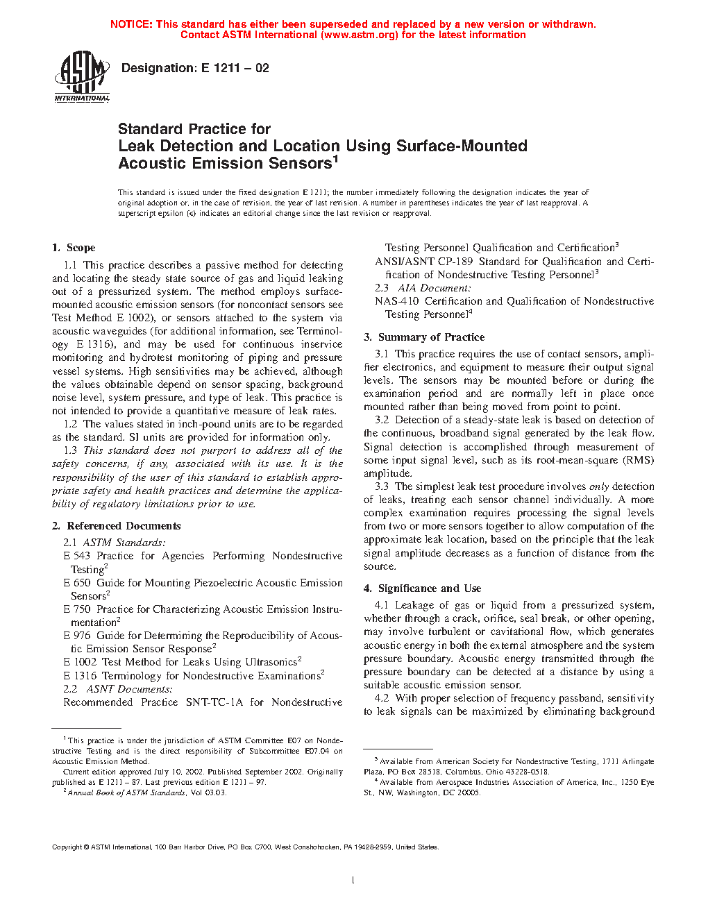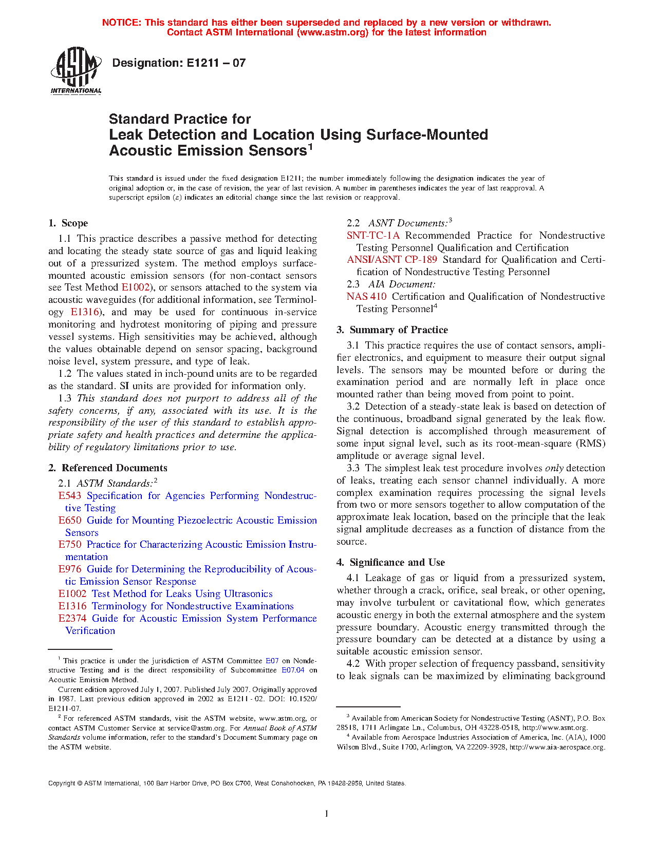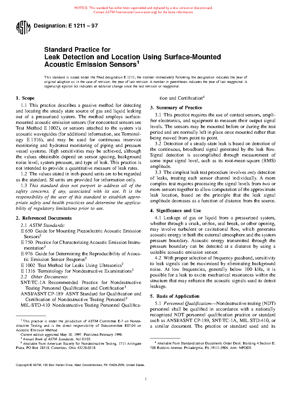 1.1 This practice describes a passive method for detecting and locating the steady state source of gas and liquid leaking out of a pressurized system. The method employs surface-mounted acoustic emission sensors (for noncontact sensors see Method E1002), or sensors attached to the system via acoustic waveguides (for additional information, see Terminology E1316), and may be used for continuous inservice monitoring and hydrotest monitoring of piping and pressure vessel systems. High sensitivities may be achieved, although the values obtainable depend on sensor spacing, background noise level, system pressure, and type of leak. This practice is not intended to provide a quantitative measure of leak rates.