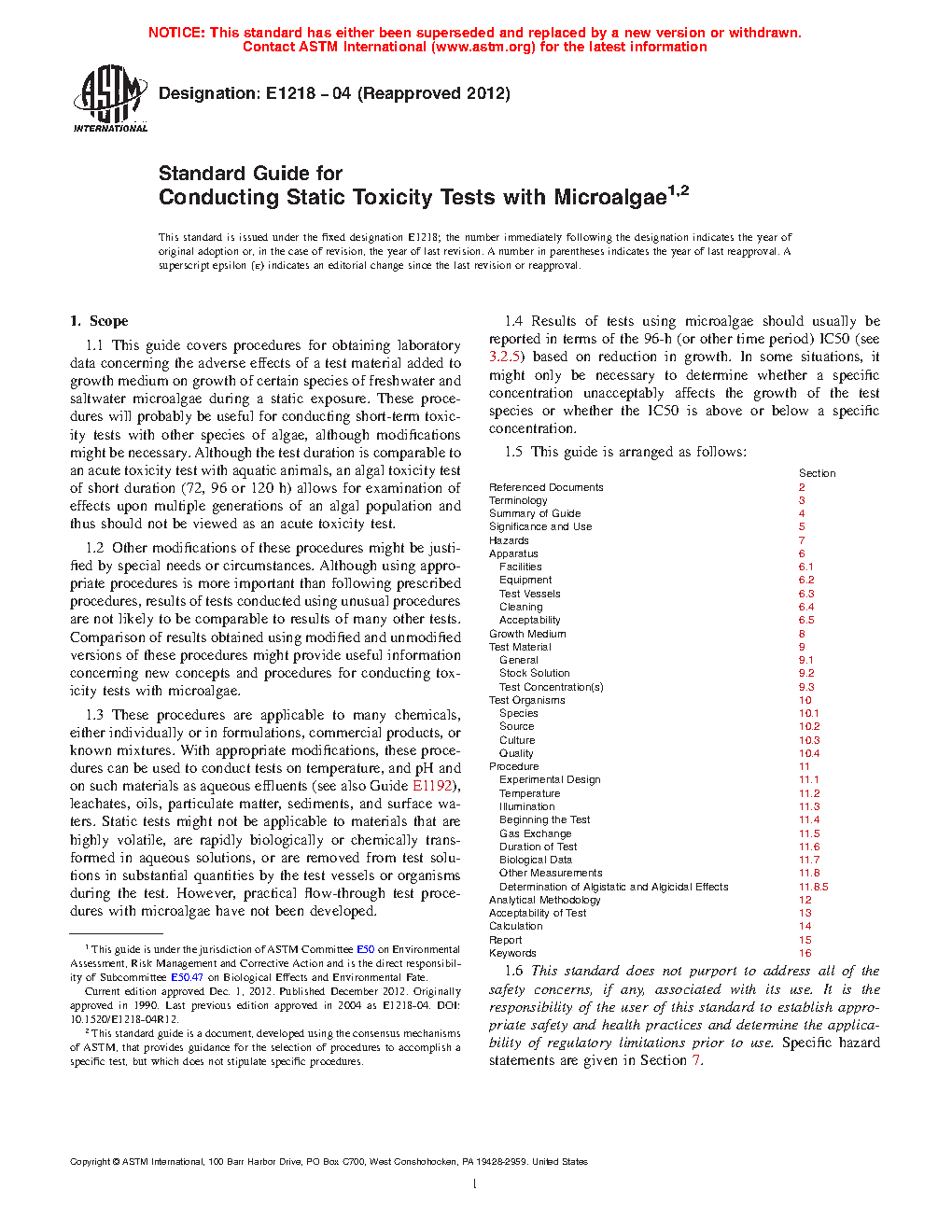 1.1 This guide covers procedures for obtaining laboratory data concerning the adverse effects of a test material added to growth medium on growth of certain species of freshwater and saltwater microalgae during a static exposure. These procedures will probably be useful for conducting short-term toxicity tests with other species of algae, although modifications might be necessary. Although the test duration is comparable to an acute toxicity test with aquatic animals, an algal toxicity test of short duration (72, 96 or 120 h) allows for examination of effects upon multiple generations of an algal population and thus should not be viewed as an acute toxicity test.
