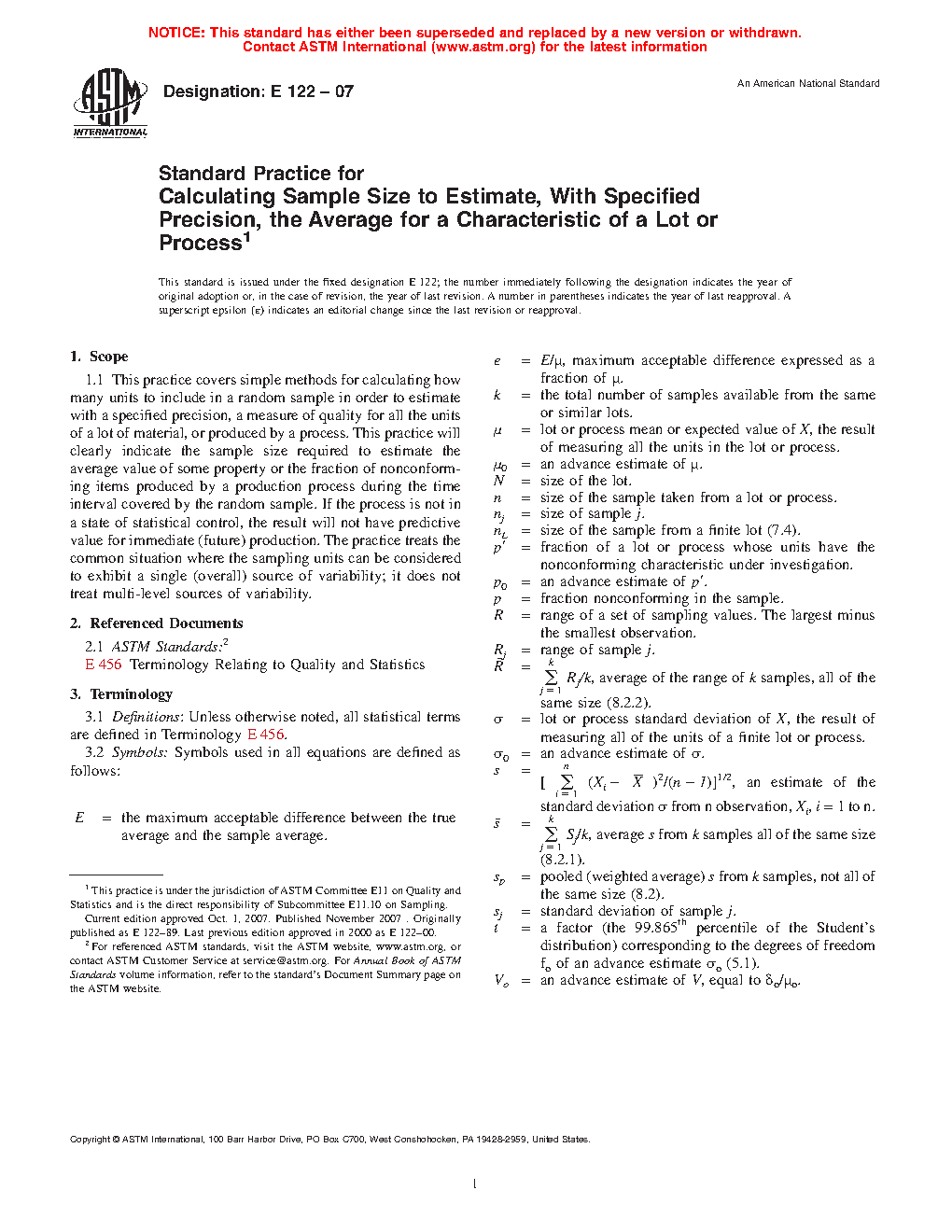 This practice is intended for use in determining the sample size required to estimate, with specified precision, a measure of quality of a lot or process. The practice applies when quality is expressed as either the lot average for a given property, or as the lot fraction not conforming to prescribed standards. The level of a characteristic may often be taken as an indication of the quality of a material. If so, an estimate of the average value of that characteristic or of the fraction of the observed values that do not conform to a specification for that characteristic becomes a measure of quality with respect to that characteristic. This practice is intended for use in determining the sample size required to estimate, with specified precision, such a measure of the quality of a lot or process either as an average value or as a fraction not conforming to a specified value.
