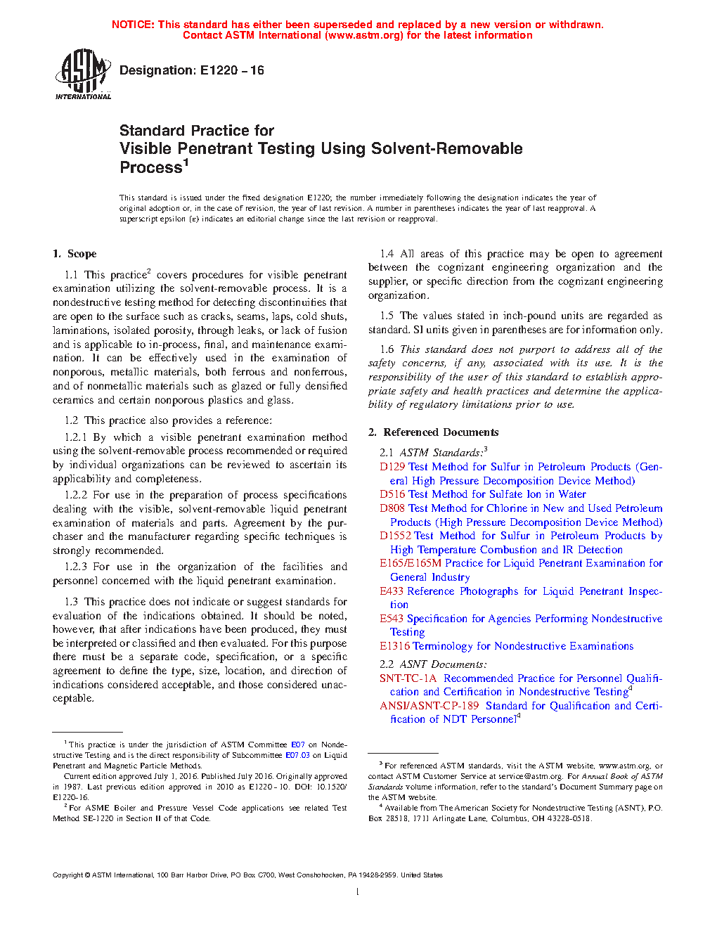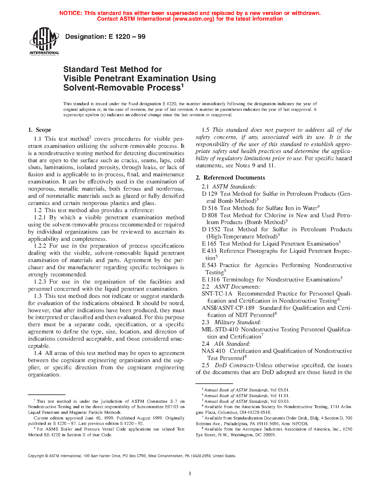 1.1 This test method covers procedures for visible penetrant examination utilizing the solvent-removable process. It is a nondestructive testing method for detecting discontinuities that are open to the surface such as cracks, seams, laps, cold shuts, laminations, isolated porosity, through leaks, or lack of fusion and is applicable to in-process, final, and maintenance examination. It can be effectively used in the examination of nonporous, metallic materials, both ferrous and nonferrous, and of nonmetallic materials such as glazed or fully densified ceramics and certain nonporous plastics and glass.