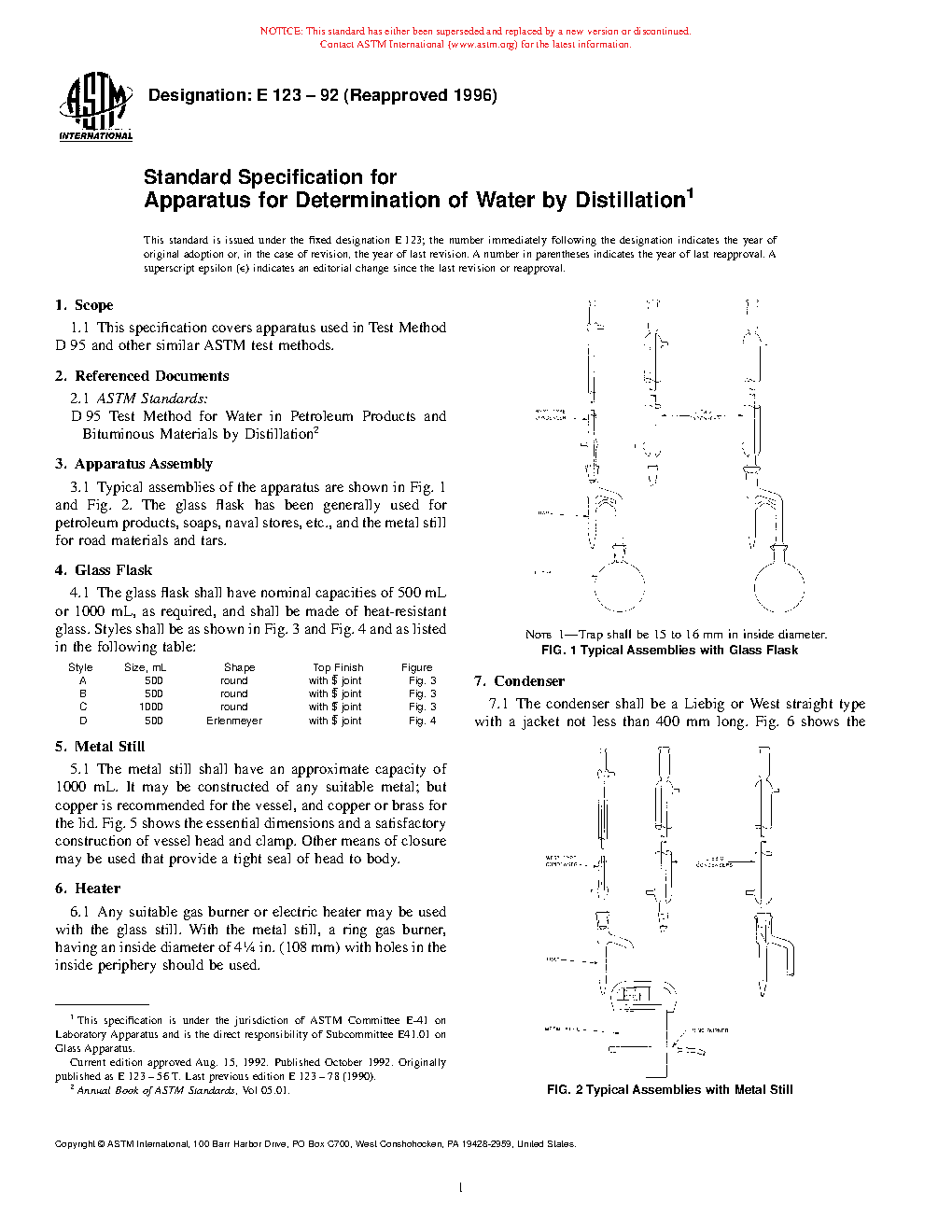 This specification covers the design and dimensional requirements for the assembly that comprise the laboratory apparatus used for determining water in petroleum products and bituminous materials by means of distillation. The assembly shall be composed of the following equipment: glass flask; metal still; gas burner or electric heater; Liebig- or West-type condenser; and traps.