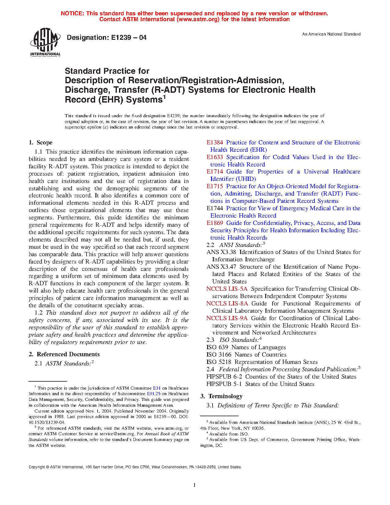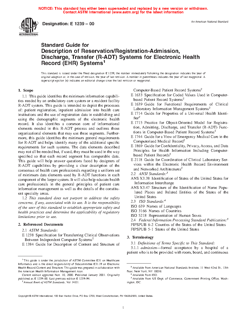 1.1 This practice identifies the minimum information capabilities needed by an ambulatory care system or a resident facility R-ADT system. This practice is intended to depict the processes of: patient registration, inpatient admission into health care institutions and the use of registration data in establishing and using the demographic segments of the electronic health record. It also identifies a common core of informational elements needed in this R-ADT process and outlines those organizational elements that may use these segments. Furthermore, this guide identifies the minimum general requirements for R-ADT and helps identify many of the additional specific requirements for such systems. The data elements described may not all be needed but, if used, they must be used in the way specified so that each record segment has comparable data. This practice will help answer questions faced by designers of R-ADT capabilities by providing a clear description of the consensus of health care professionals regarding a uniform set of minimum data elements used by R-ADT functions in each component of the larger system. It will also help educate health care professionals in the general principles of patient care information management as well as the details of the constituent specialty areas.