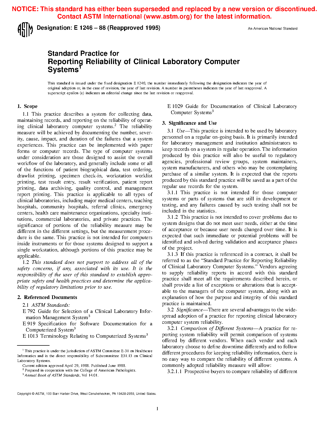 1.1 This practice describes a system for collecting data, maintaining records, and reporting on the reliability of operating clinical laboratory computer systems. The reliability measure will be achieved by documenting the number, severity, cause, impact, and duration of the failures that a system experiences. This practice can be implemented with paper forms or computer records. The type of computer systems under consideration are those designed to assist the overall workflow of the laboratory, and generally include some or all of the functions of patient biographical data, test ordering, draw list printing, specimen check-in, workstation work list printing, test result entry, result verification, patient report printing, data archiving, quality control, and management report printing. This practice is applicable to all types of clinical laboratories, including major medical centers, teaching hospitals, community hospitals, referral clinics, emergency centers, health care maintenance organizations, specialty institutions, commercial laboratories, and private practices. The significance of portions of the reliability measure may be different in the different settings, but the measurement procedure is the same. This practice is not intended for computers inside instruments or for those systems designed to support a single workstation, although portions of this practice may be applicable.