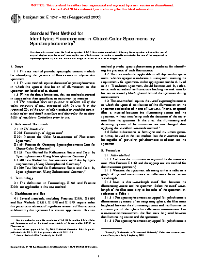 Note 2: In editions of E1247 – 92 and earlier, the test of fluorescence was the two sets of spectral transmittances or radiance factor (reflectance factors) differ by 1 % of full scale at the wavelength of greatest difference.