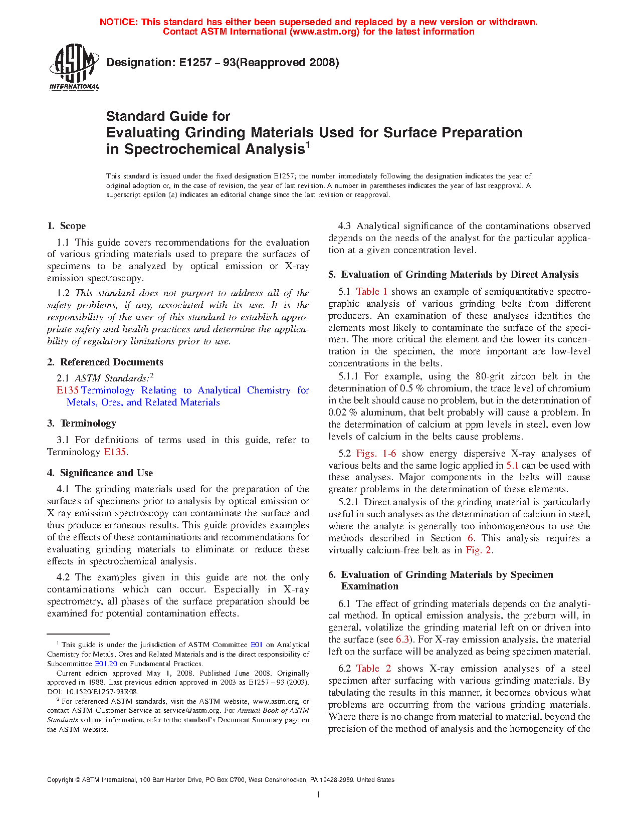 4.1 The grinding materials used for the preparation of the surfaces of specimens prior to analysis by spark atomic emission or X-ray fluorescence spectrometry can contaminate the surface and thus produce erroneous results. This guide provides examples of the effects of these contaminations and recommendations for evaluating grinding materials to eliminate or reduce these effects in spectrochemical analysis.