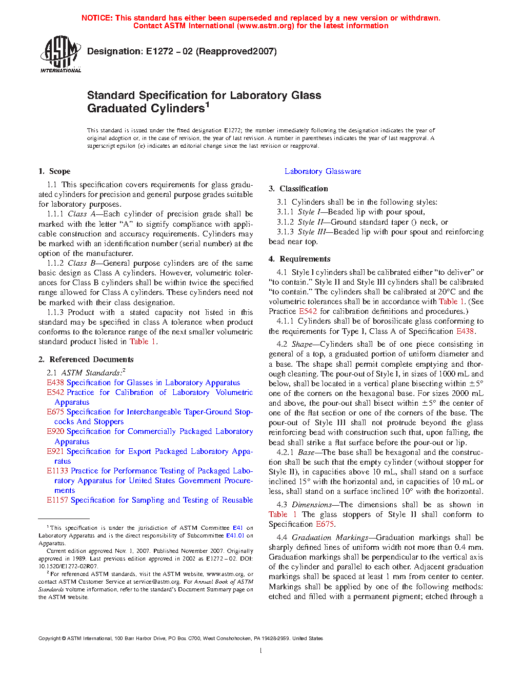 This specification covers the requirements for laboratory glass graduated cylinders for precision and general purpose grades. The graduated cylinders may be in one of three styles; beaded lip with spout, grounded standard taper neck, or beaded lip with pour spout and reinforcing band near the top. The products should conform to the required cylinder and base shapes, dimensions, quality of gradation and identification markings, and length of gradation lines.