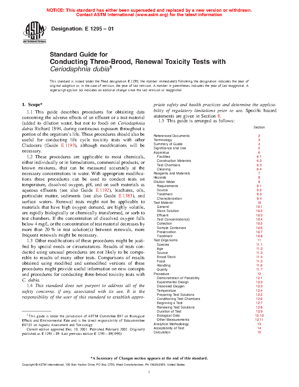 1.3 Other modifications of these procedures might be justified by special needs or circumstances. Results of tests conducted using unusual procedures are not likely to be comparable to results of many other tests. Comparisons of results obtained using modified and unmodified versions of these procedures might provide useful information on new concepts and procedures for conducting three-brood toxicity tests with