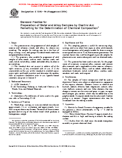 1.1 This practice covers the preparation of solid samples of reactive and refractory metals and alloys by electric arc remelting. The samples for melting may be in the form of chips, turnings, wires, and sponge. Powdered metals need to be compacted before melting.