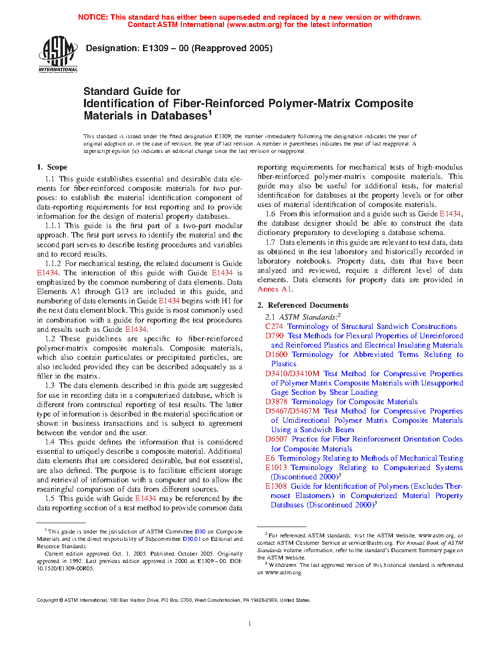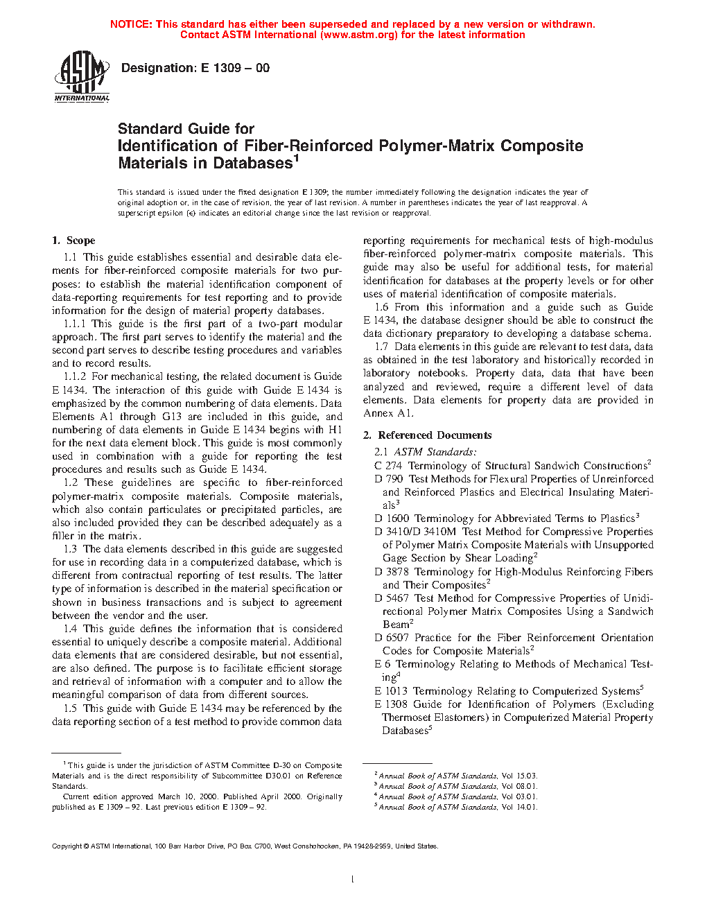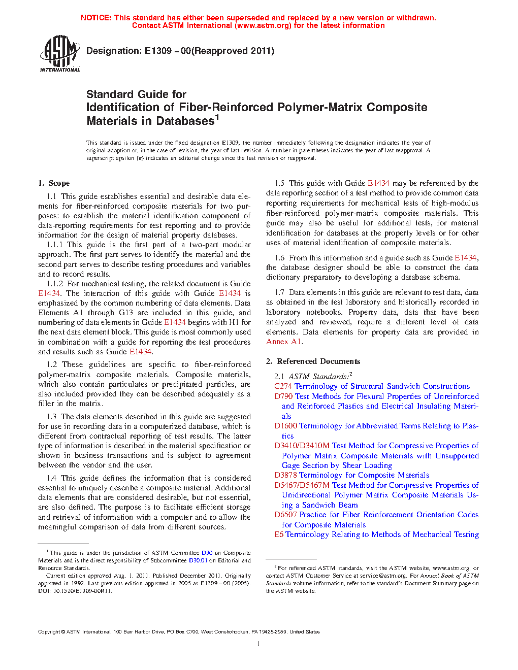 1.4 This guide defines the information that is considered essential to uniquely describe a composite material. Additional data elements that are considered desirable, but not essential, are also defined. The purpose is to facilitate efficient storage and retrieval of information with a computer and to allow the meaningful comparison of data from different sources.