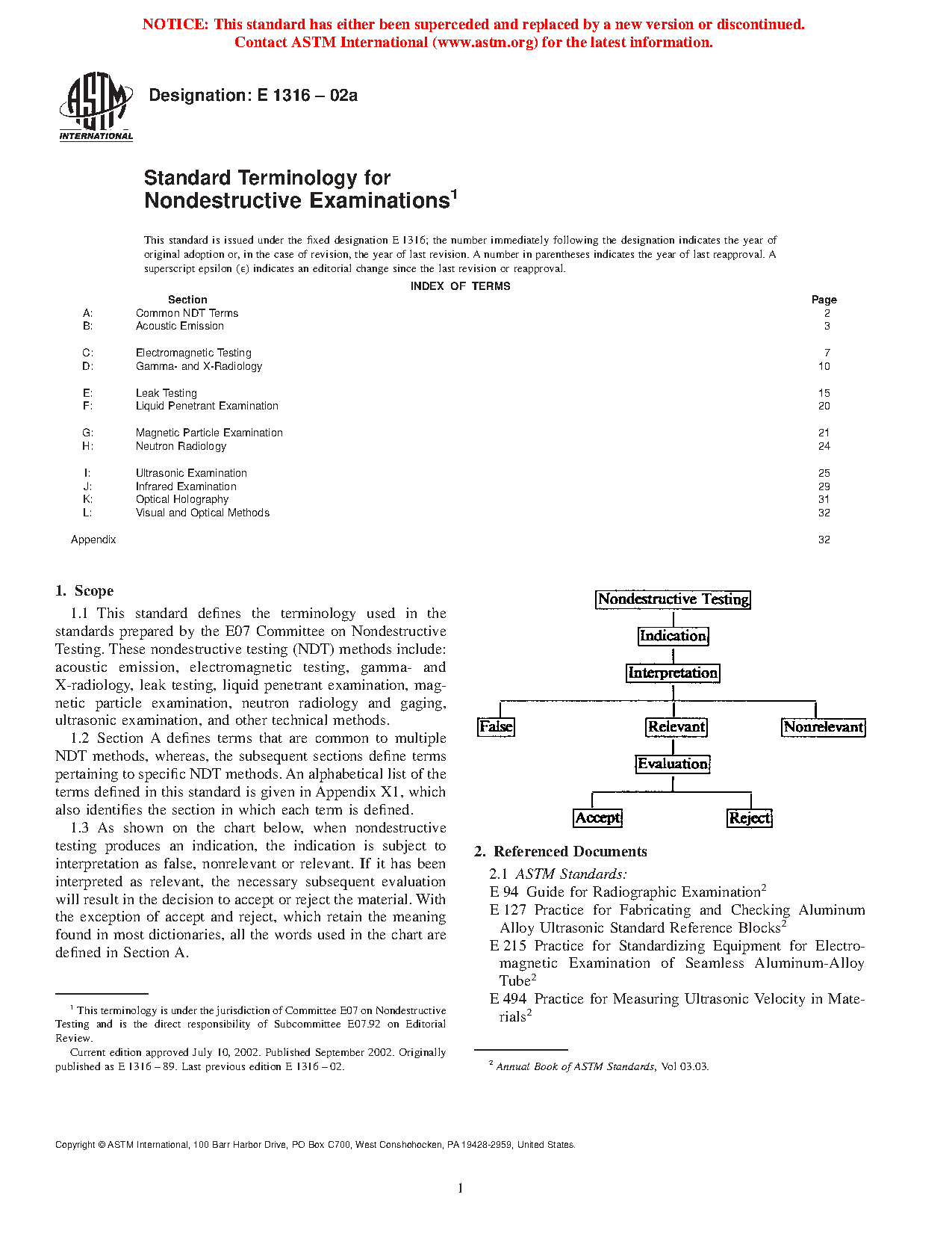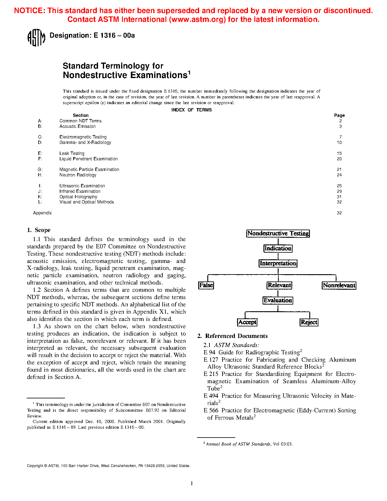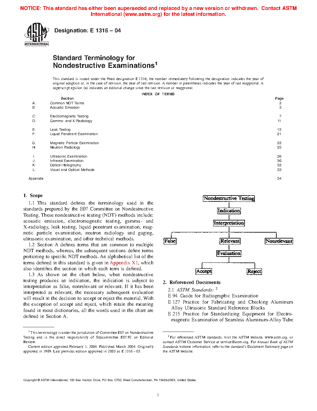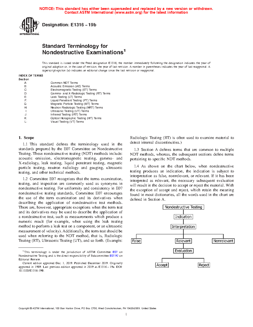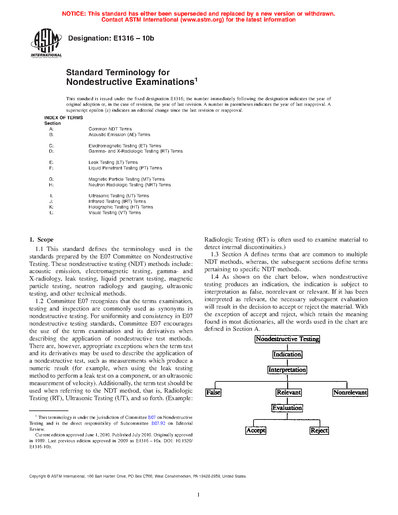 1.4 As shown on the chart below, when nondestructive testing produces an indication, the indication is subject to interpretation as false, nonrelevant or relevant. If it has been interpreted as relevant, the necessary subsequent evaluation will result in the decision to accept or reject the material. With the exception of accept and reject, which retain the meaning found in most dictionaries, all the words used in the chart are defined in Section A.