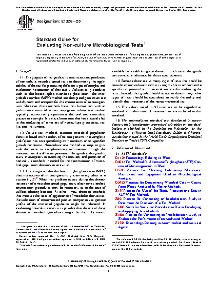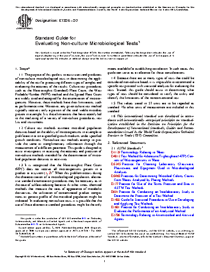 1.1 The purpose of this guide is to assist users and producers of non-culture microbiological tests in determining the applicability of the test for processing different types of samples and evaluating the accuracy of the results. Culture test procedures such as the heterotrophic (standard) plate count, the most probable number (MPN) method and the spread plate count are widely cited and accepted for the enumeration of microorganisms. However, these methods have their limitations, such as performance time. Moreover, any given culture test method typically recovers only a portion of the total viable microbes present in a sample. It is these limitations that have recently led to the marketing of a variety of non-culture procedures, test kits and instruments.