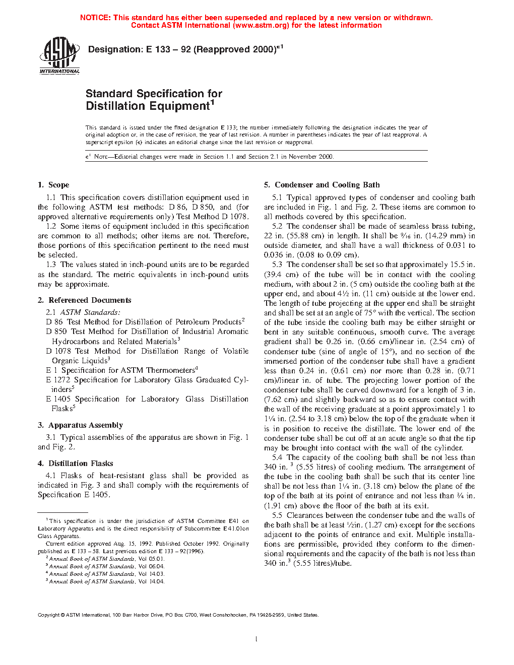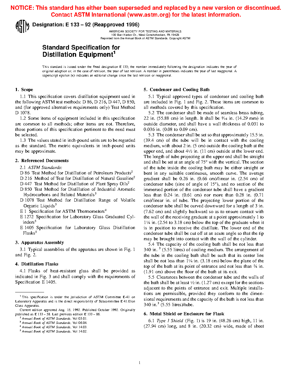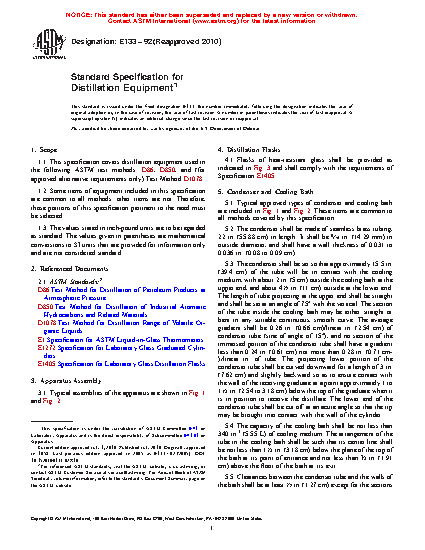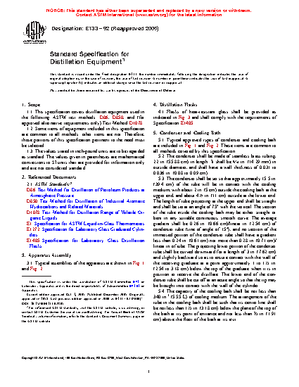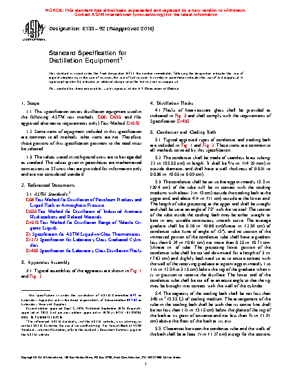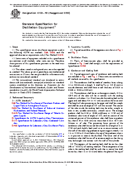 1.1 This specification covers distillation equipment used in the following ASTM test methods: D86, D850, and (for approved alternative requirements only) Test Method D1078.