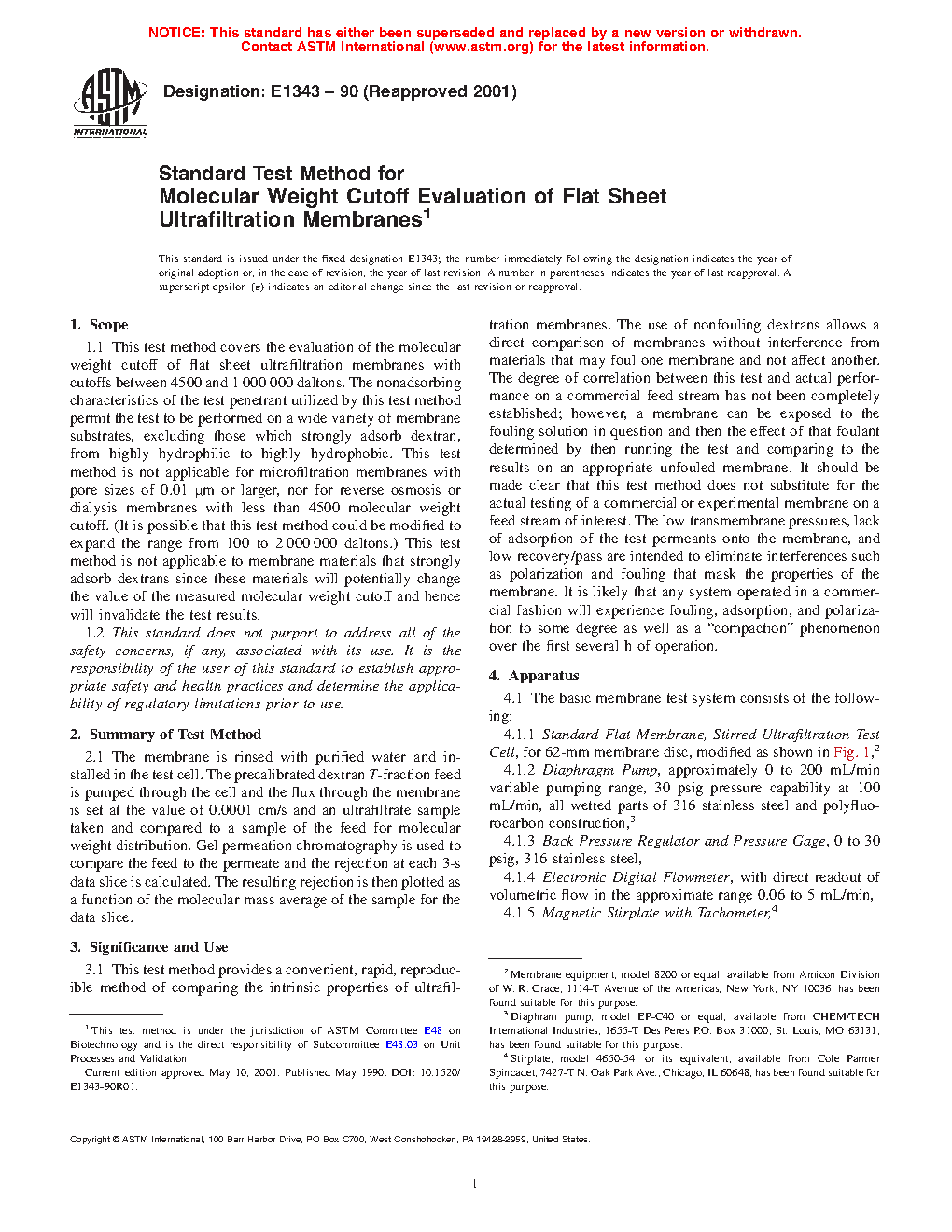 This test method provides a convenient, rapid, reproducible method of comparing the intrinsic properties of ultrafiltration membranes. The use of nonfouling dextrans allows a direct comparison of membranes without interference from materials that may foul one membrane and not affect another. The degree of correlation between this test and actual performance on a commercial feed stream has not been completely established; however, a membrane can be exposed to the fouling solution in question and then the effect of that foulant determined by then running the test and comparing to the results on an appropriate unfouled membrane. It should be made clear that this test method does not substitute for the actual testing of a commercial or experimental membrane on a feed stream of interest. The low transmembrane pressures, lack of adsorption of the test permeants onto the membrane, and low recovery/pass are intended to eliminate interferences such as polarization and fouling that mask the properties of the membrane. It is likely that any system operated in a commercial fashion will experience fouling, adsorption, and polarization to some degree as well as a “compaction” phenomenon over the first several h of operation.