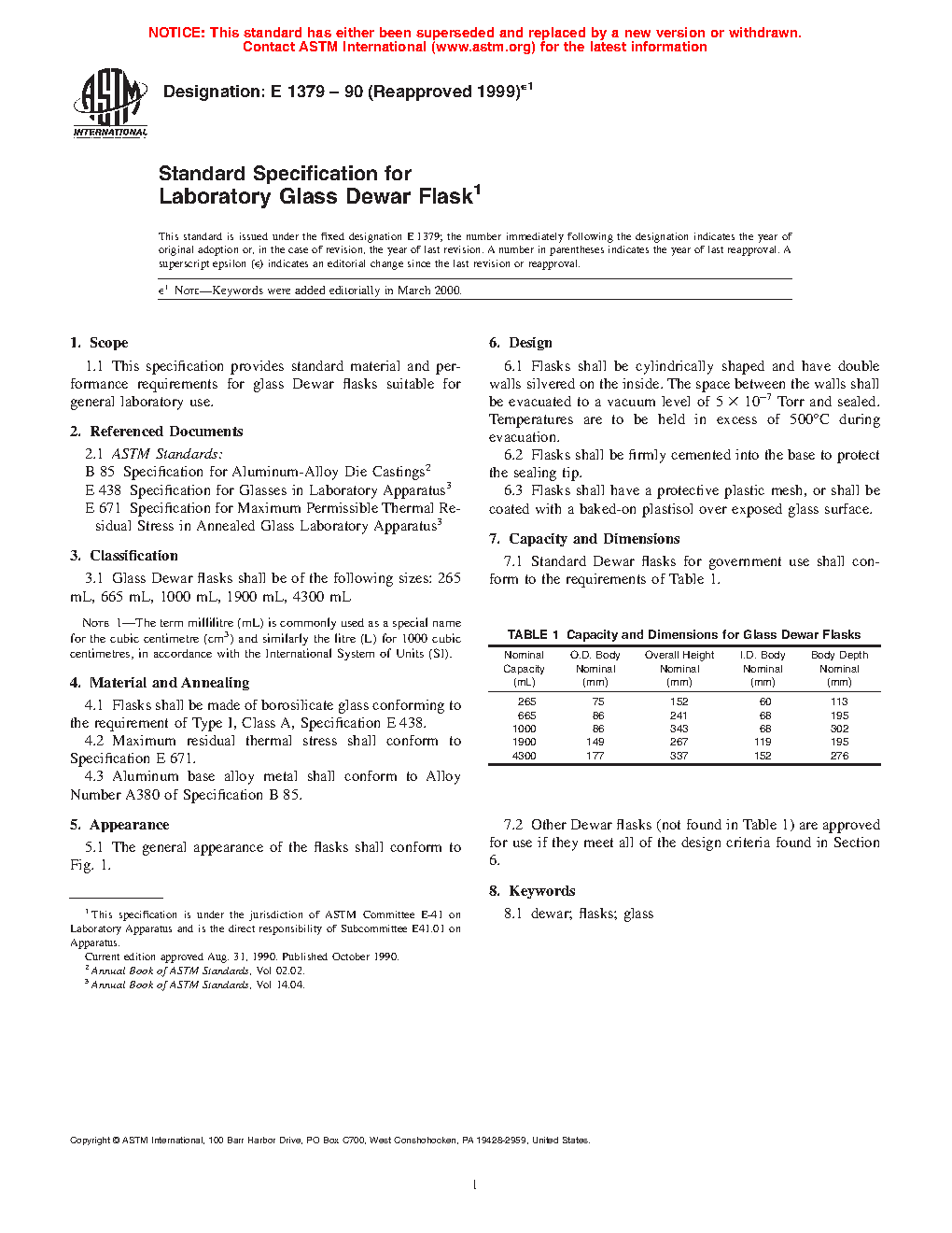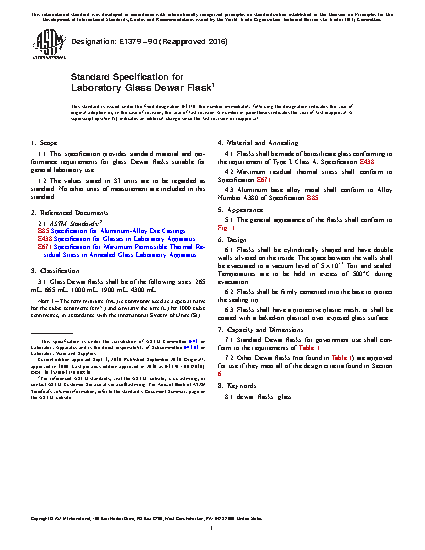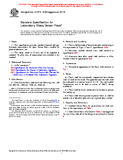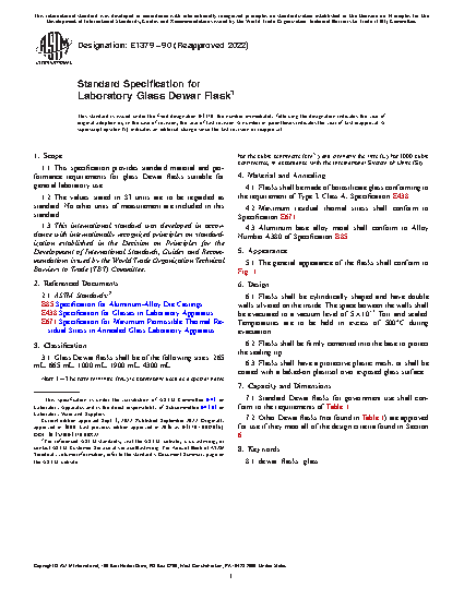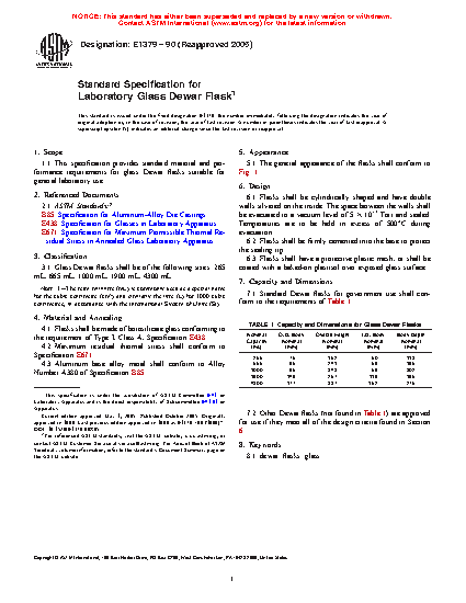 This specification provides the material and performance requirements for glass Dewar flasks suitable for general laboratory use. Flasks shall be made of Type I, Class A borosilicate glass conforming to specified maximum residual thermal stress. The properties to which the flasks shall conform are appearance, design, capacity, and dimensions.