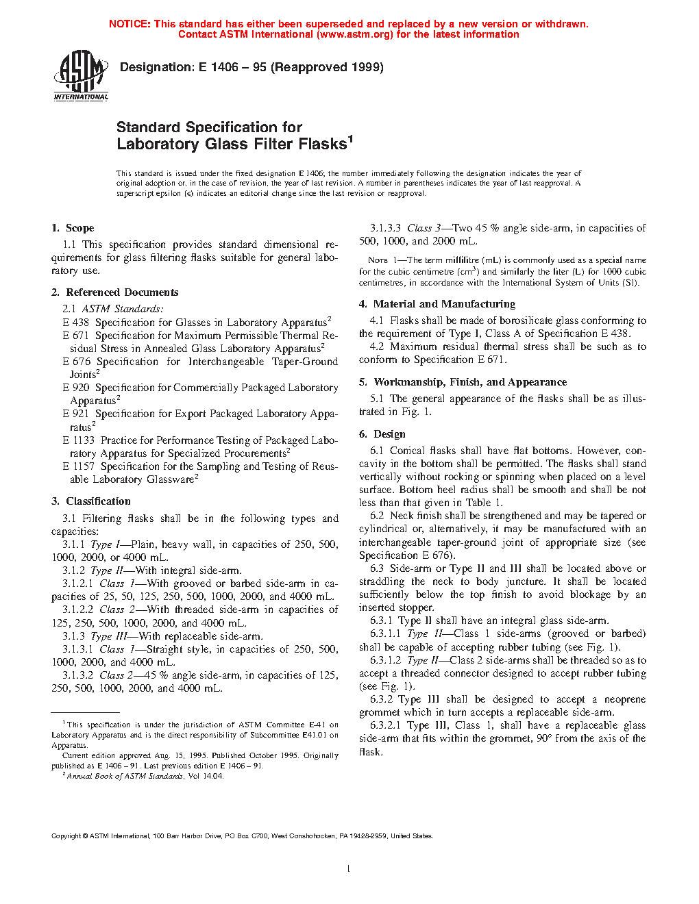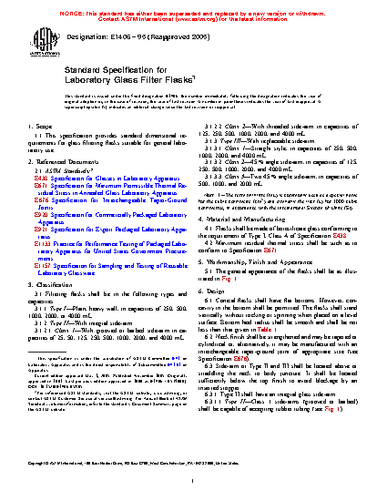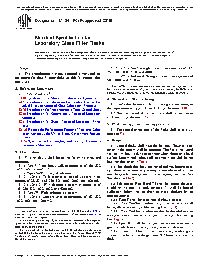 This specification provides standard dimensional requirements for glass filtering flasks suitable for general laboratory use. Glass filter flasks shall be in the following types: Type I, Type II (Class 1 and Class 2), and Type III (Class 1, Class 2, and Class 3). Flasks shall be made of the specified borosilicate glass and shall conform to the prescribed maximum residual thermal stress. The general appearance of the flasks are illustrated. The design for (1) conical flasks including bottom concavity and bottom heel radius, (2) neck finish, and (3) side-arm are specified. Filtering flasks shall conform to the prescribed requirements for (1) capacity; (2) dimensions such as body outside diameter, overall height, rubber stopper size, bottom and heel wall thickness, and base/heel radius; and (4) pressure resistance. Each flask shall be permanently marked with the name or known trademark of the manufacturer and the nominal capacity. There shall be an area on one side of the flask for marking with a pencil.